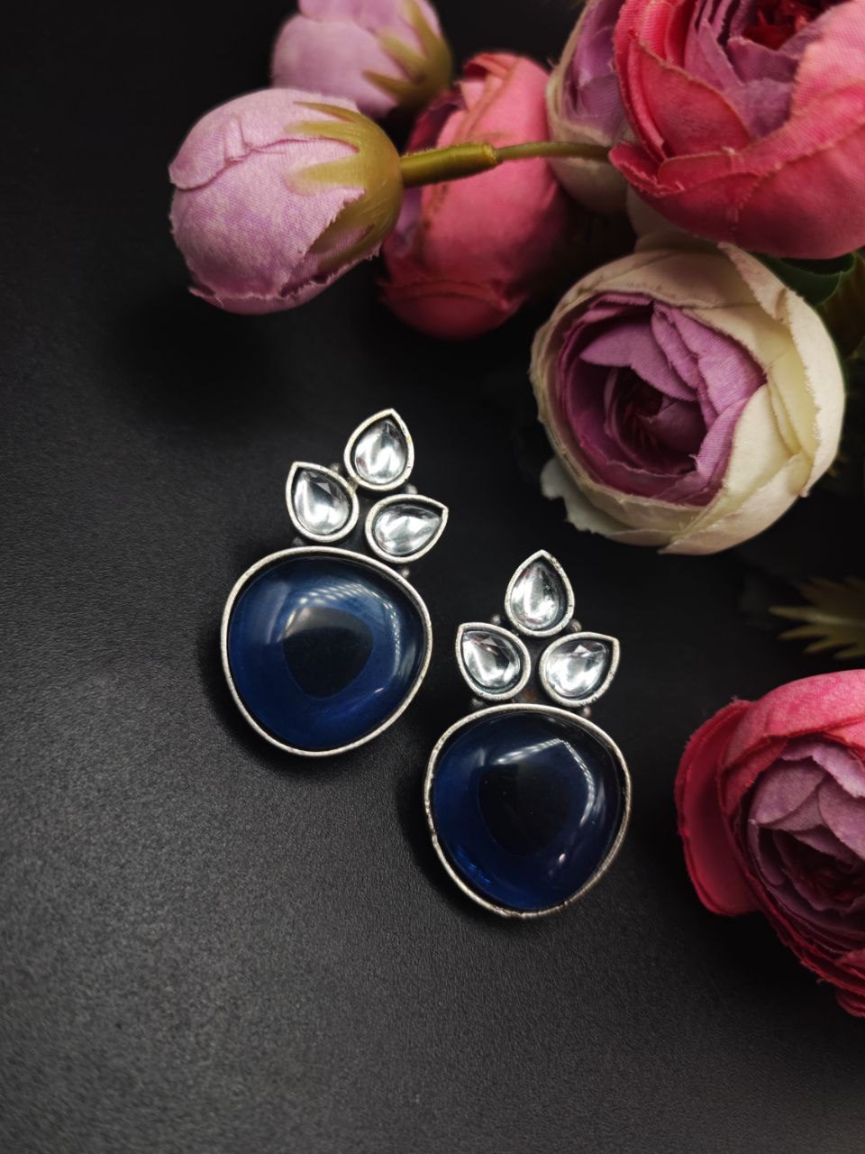 Blue Antique Monalisa Stone Stud Earring Silver Oxidised Exclusive Boho Hippie Earrings