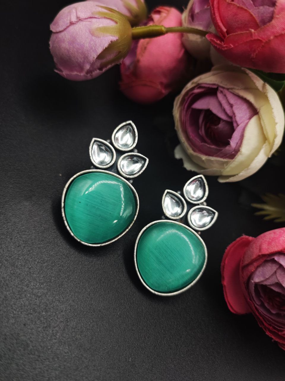 Green Antique Monalisa Stone Stud Earring Silver Oxidised Exclusive Boho Hippie Earrings