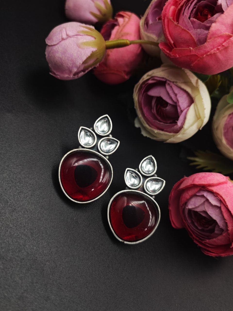Red Antique Monalisa Stone Stud Earring Silver Oxidised Exclusive Boho Hippie Earrings