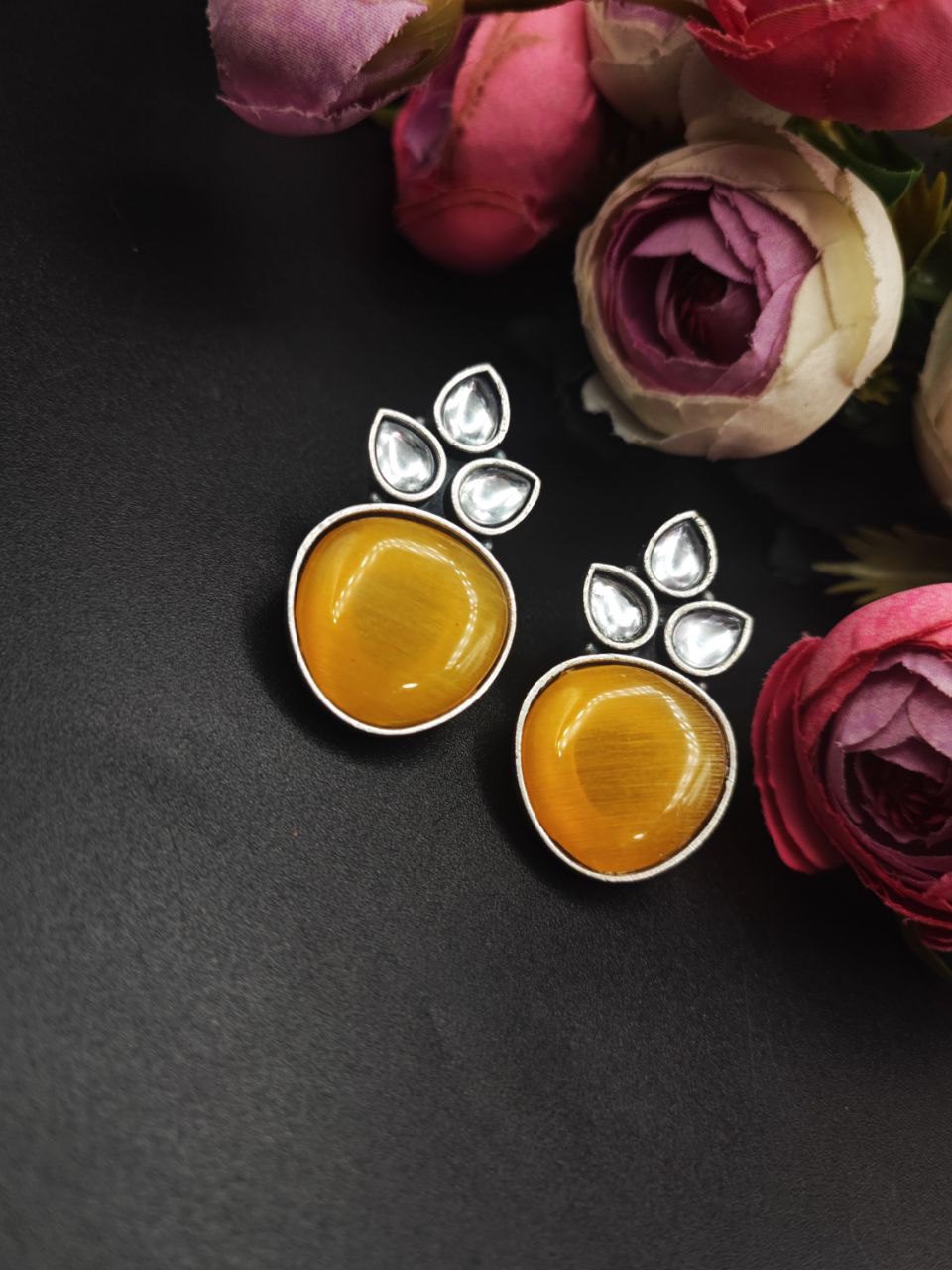 Yellow Antique Monalisa Stone Stud Earring Silver Oxidised Exclusive Boho Hippie Earrings