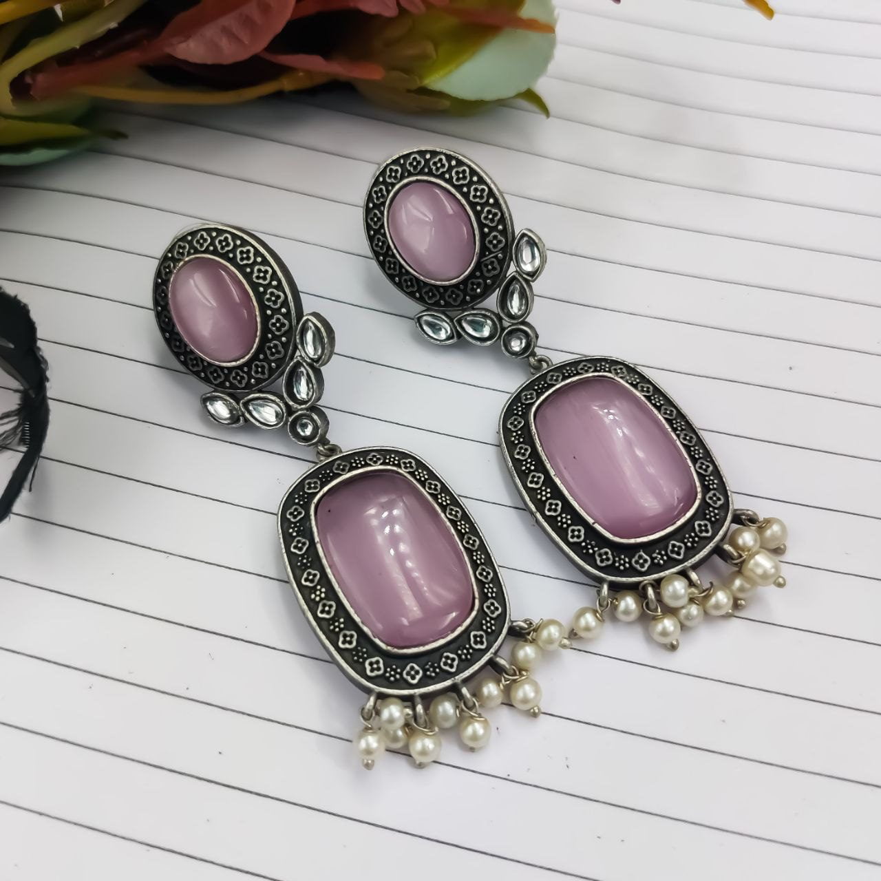 Baby Pink Elegant Rustic Silver Oxidised Monalisa Stone Dangler Earring Pearl Beads Drop Ethnic Jewelry