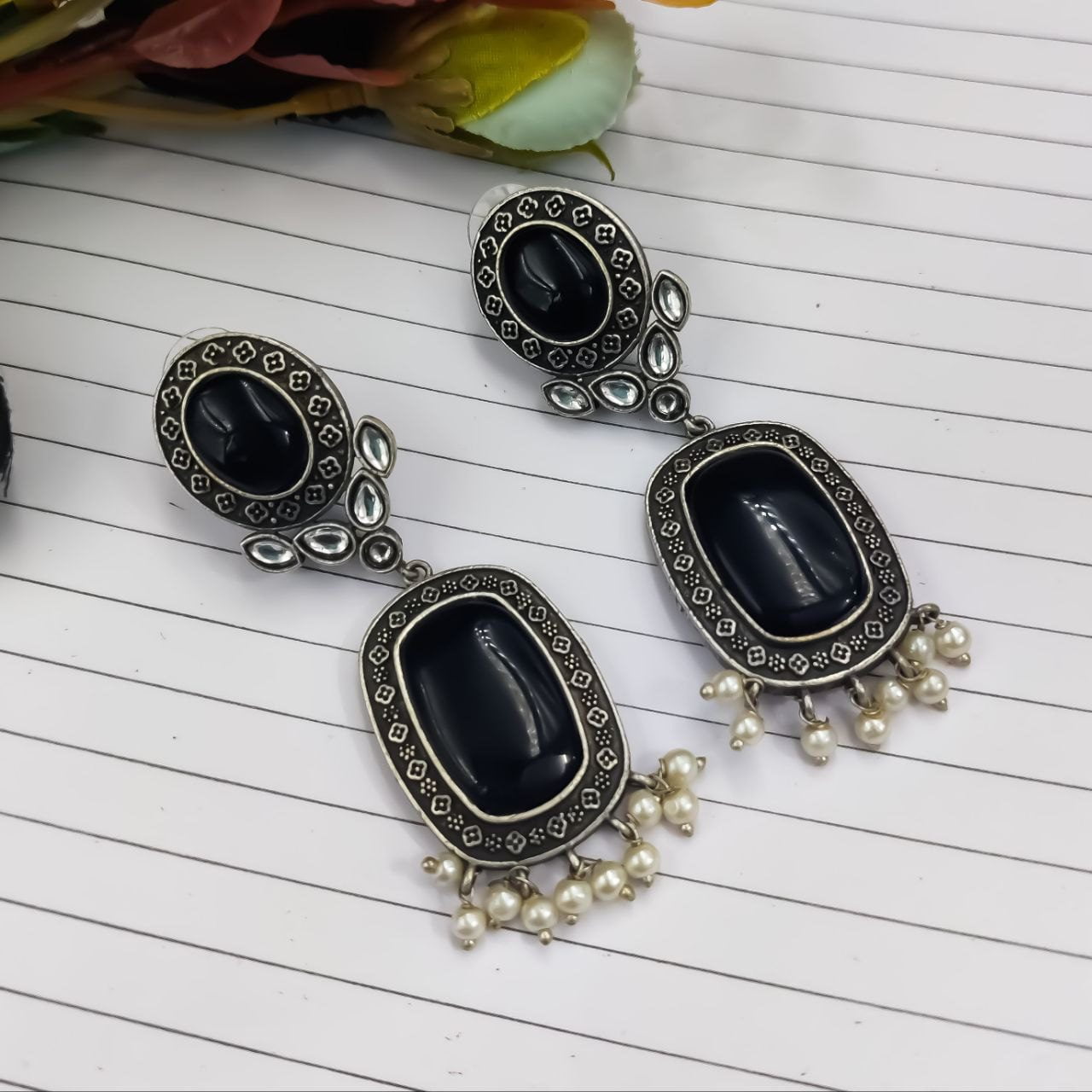 Black Elegant Rustic Silver Oxidised Monalisa Stone Dangler Earring Pearl Beads Drop Ethnic Jewelry