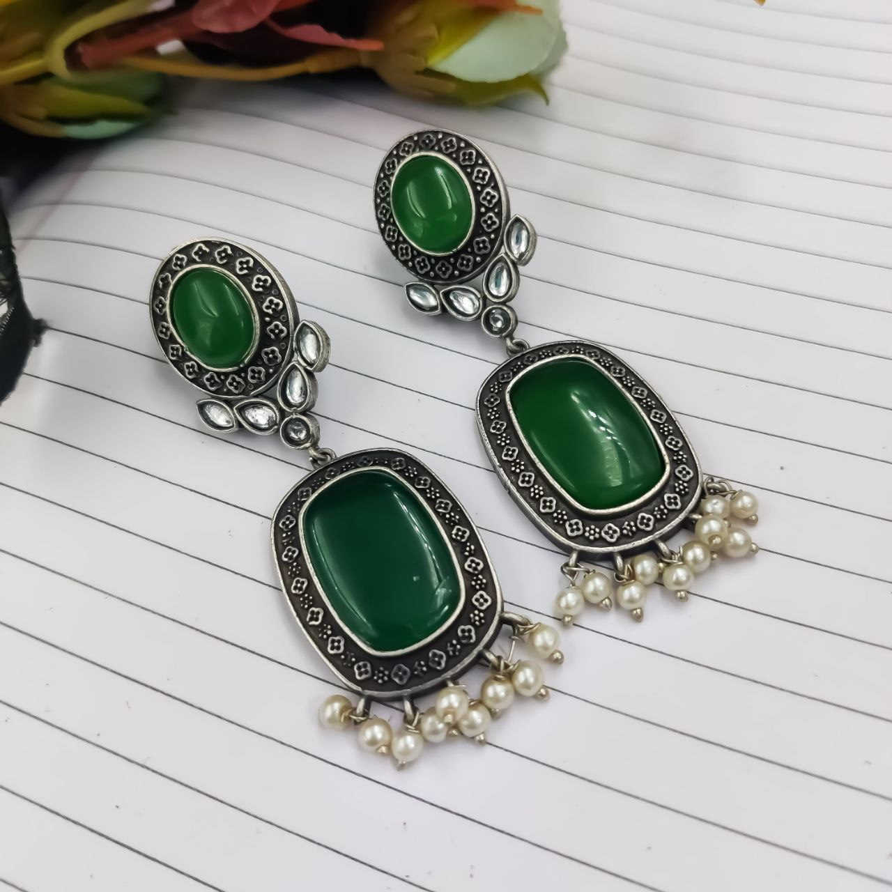 Green Elegant Rustic Silver Oxidised Monalisa Stone Dangler Earring Pearl Beads Drop Ethnic Jewelry