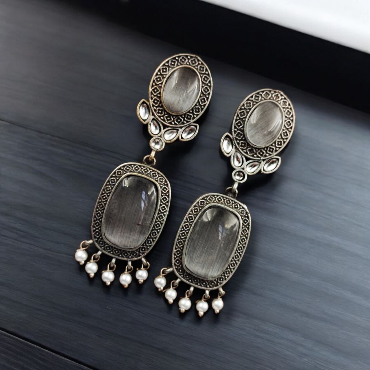 Grey Elegant Rustic Silver Oxidised Monalisa Stone Dangler Earring Pearl Beads Drop Ethnic Jewelry