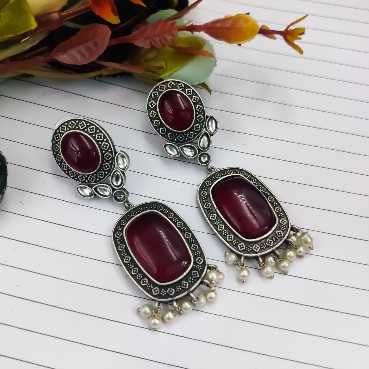 Maroon Elegant Rustic Silver Oxidised Monalisa Stone Dangler Earring Pearl Beads Drop Ethnic Jewelry