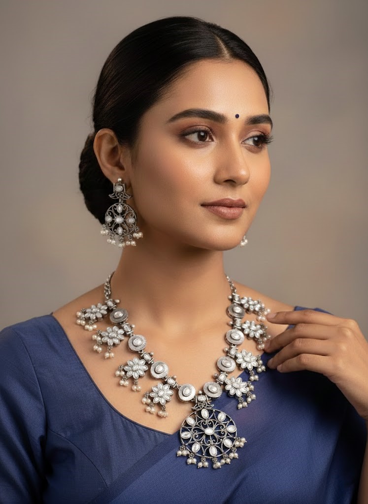 White Blue & White Tribal Oxidized Adjustable Necklace Earring Set Asian Ethnic Jewelry Set