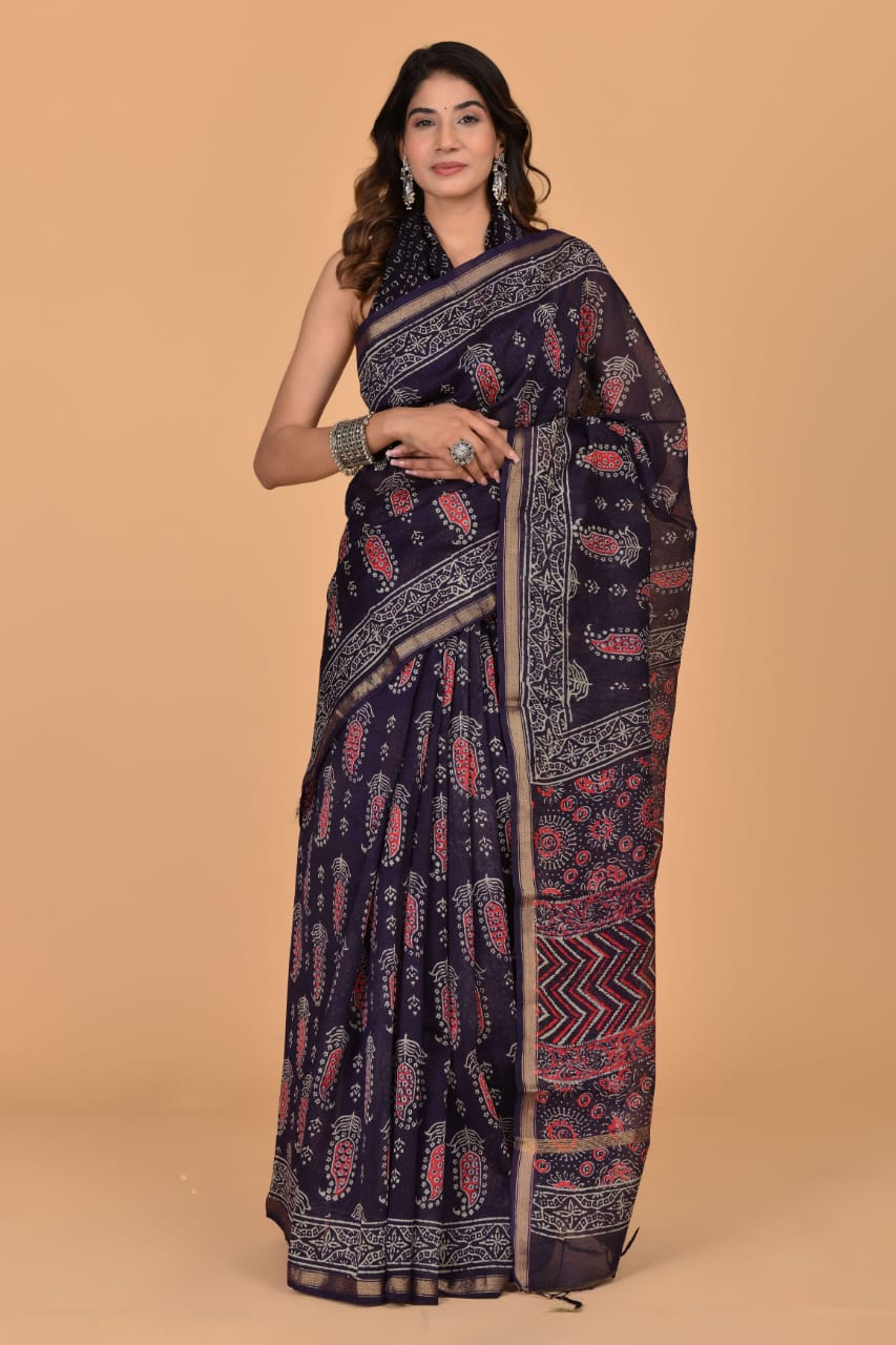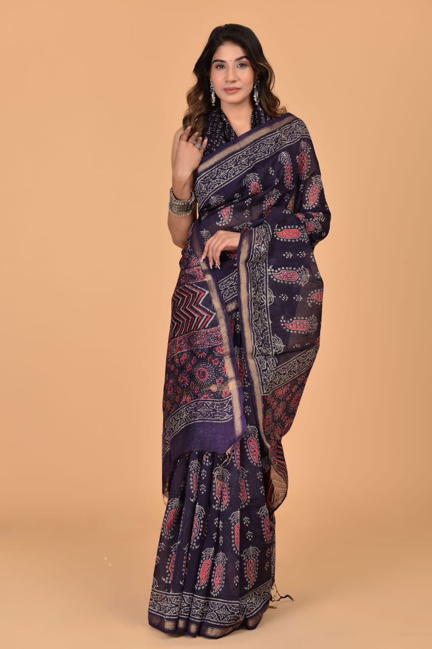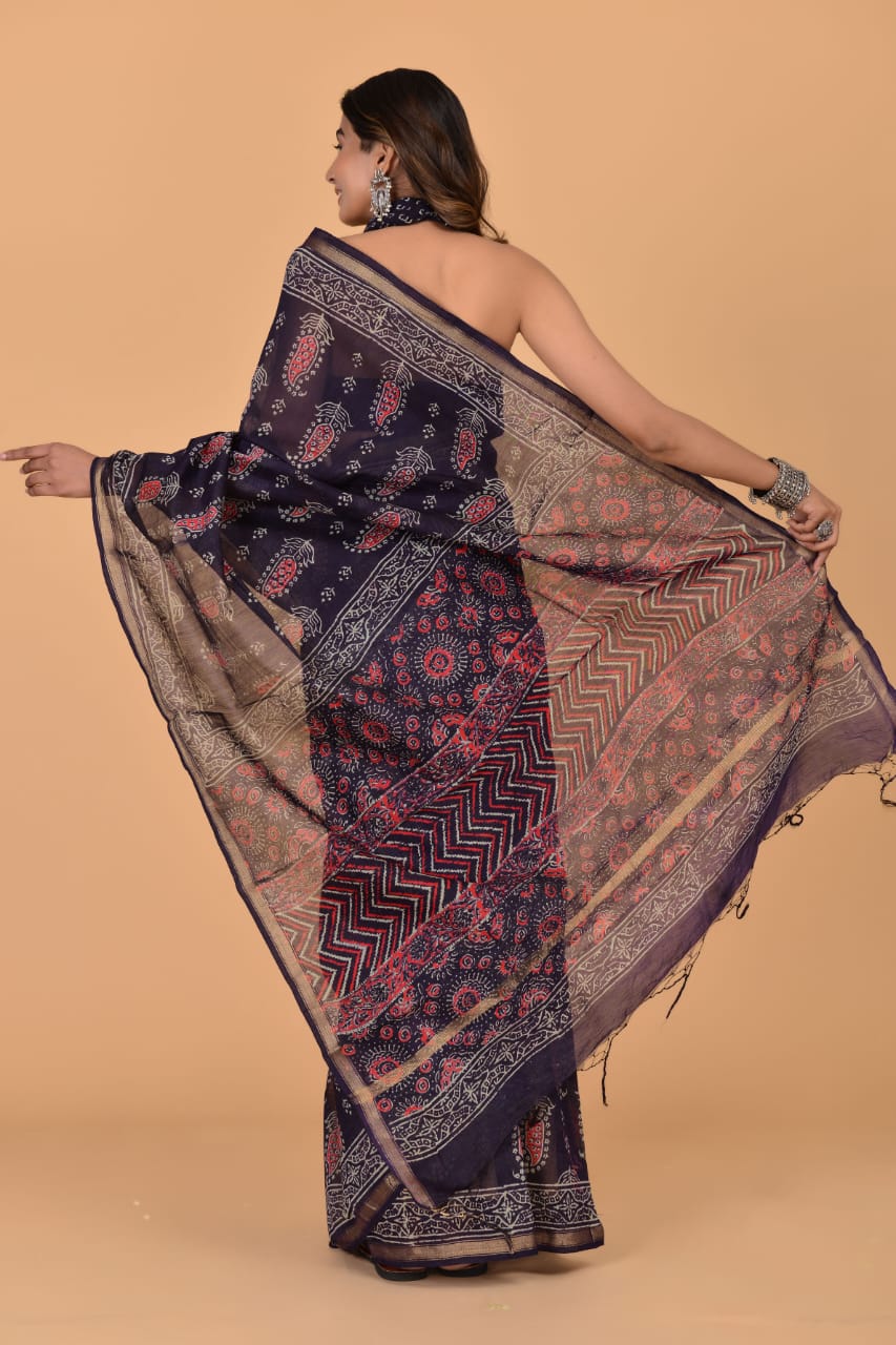 Misha Dark Blue Chanderi Silk Hand Block Floral Printed Bangla Saree with Unstitched Blouse