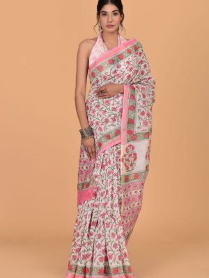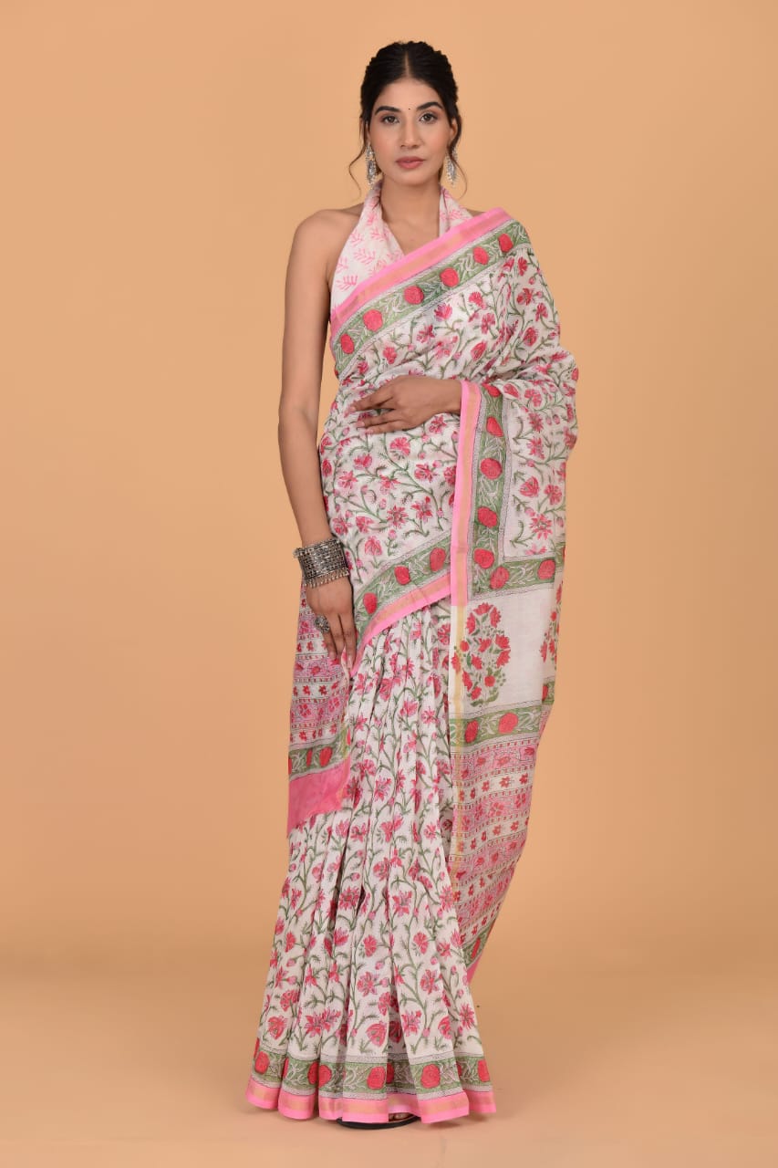 Aaliyah Beige Hand Block Floral Indian Chanderi Silk Printed Saree with Unstitched Blouse