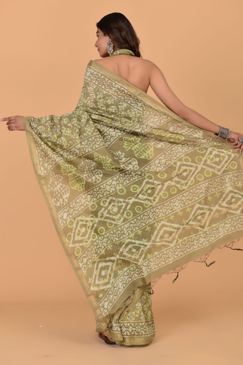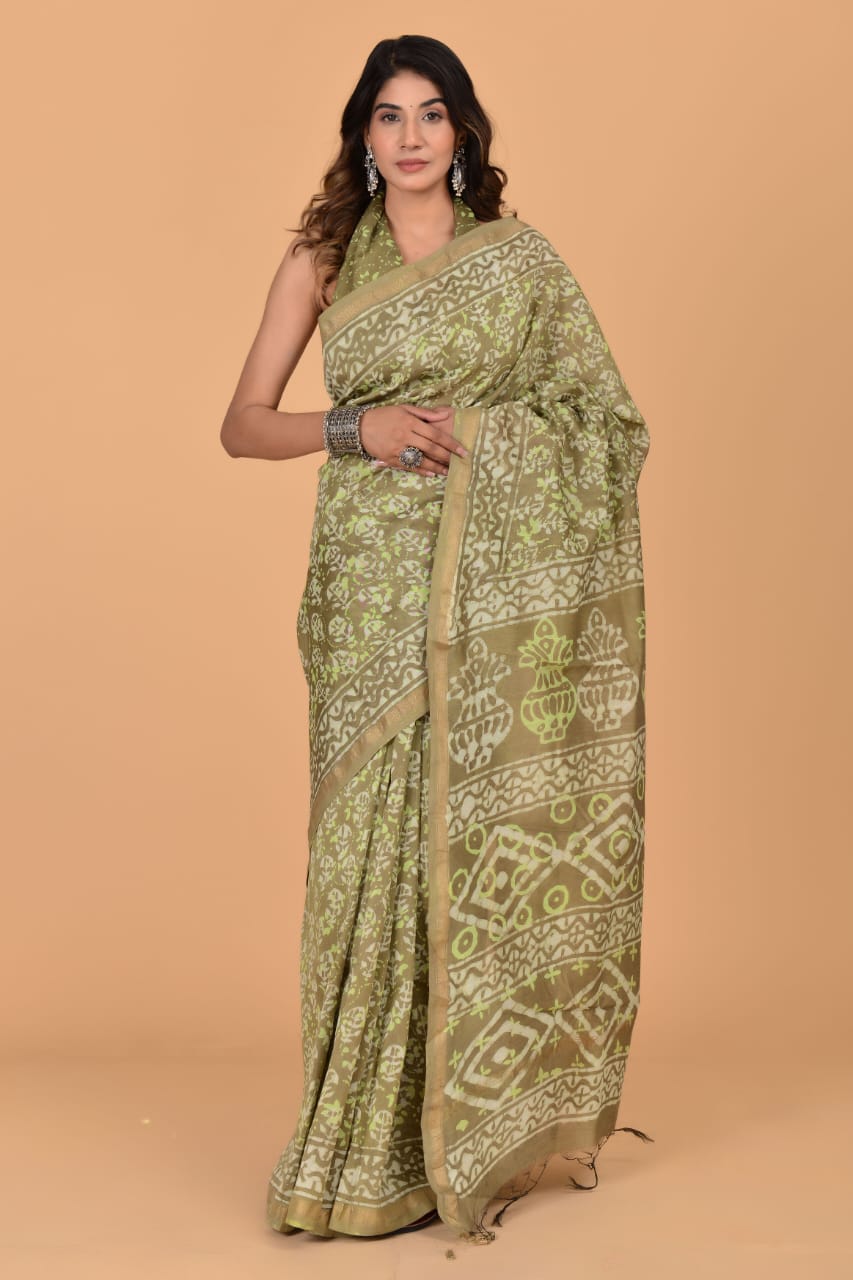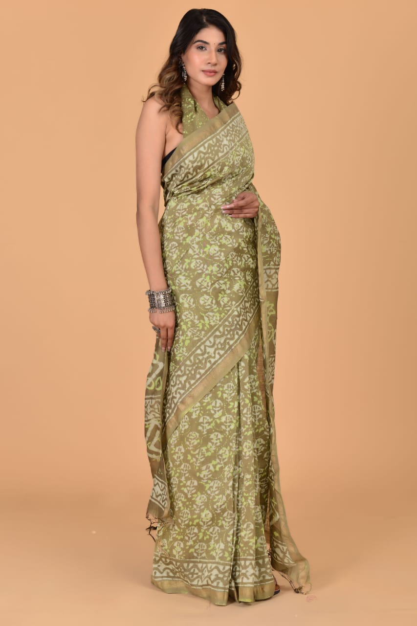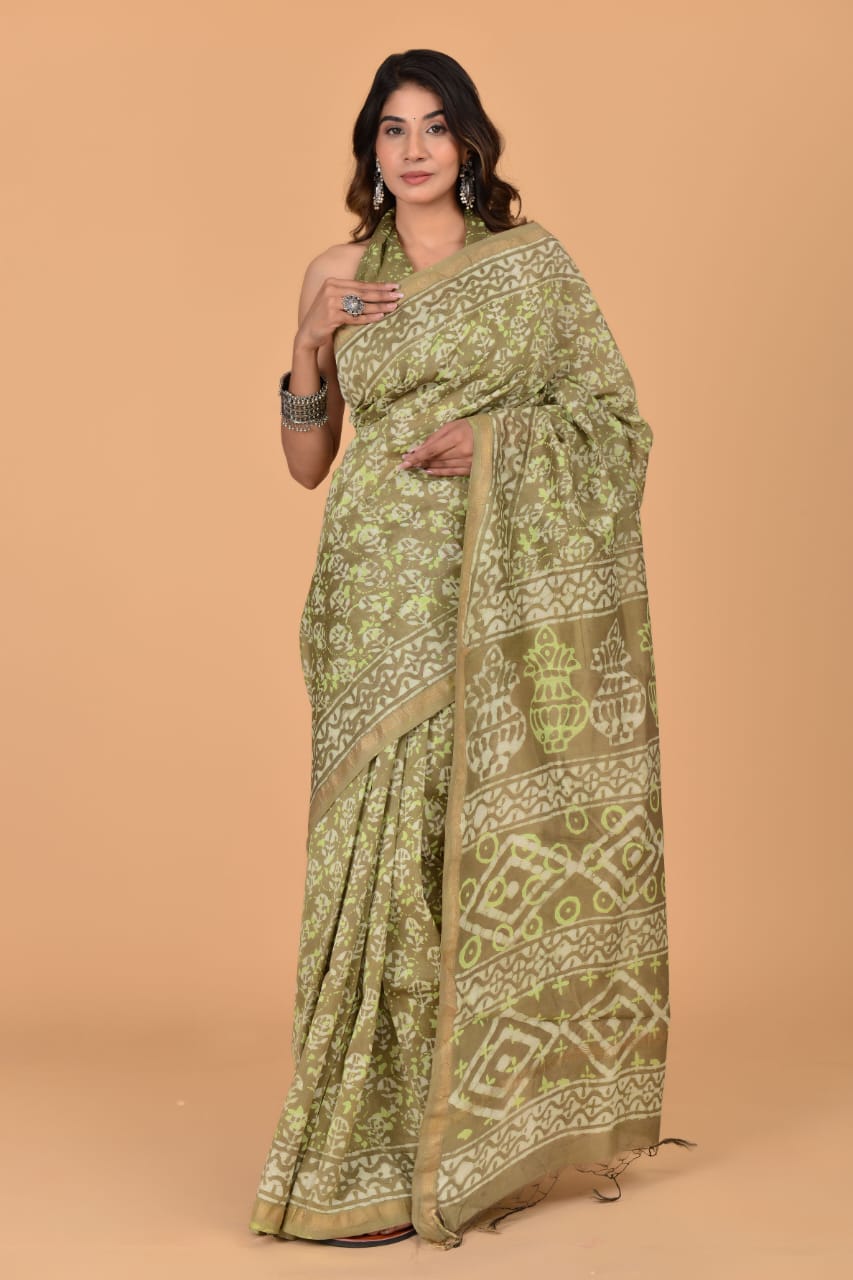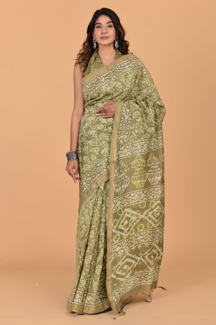 Salma Green Hand Block Floral Indian Chanderi Silk Printed Saree with Unstitched Blouse