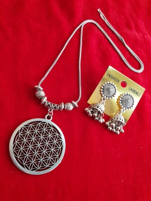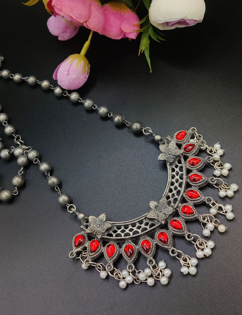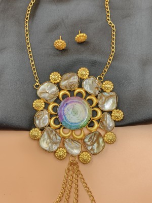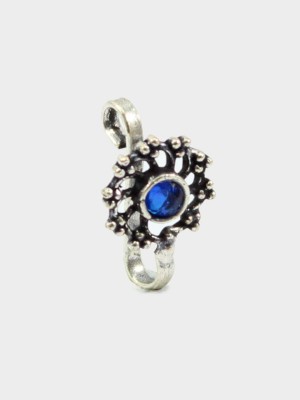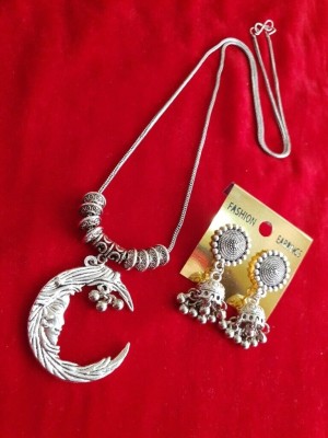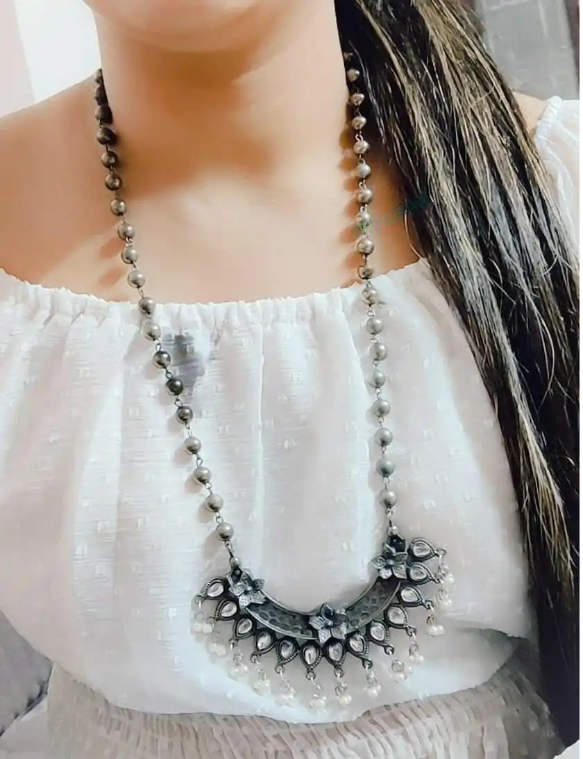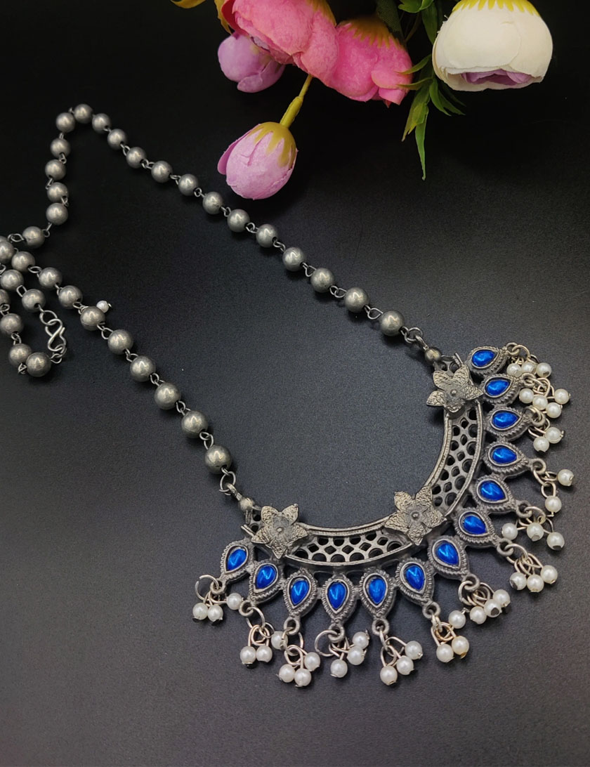 Blue Oxidized Flower on Moon Brass Long Necklace