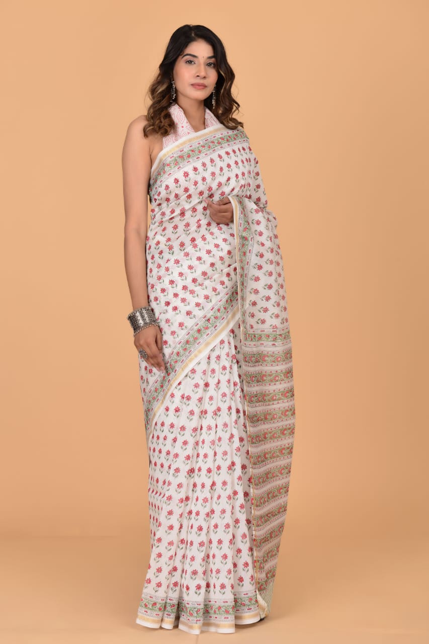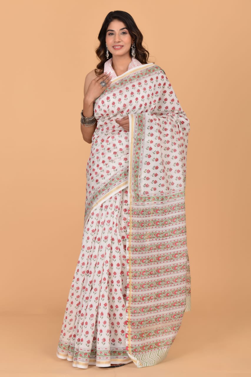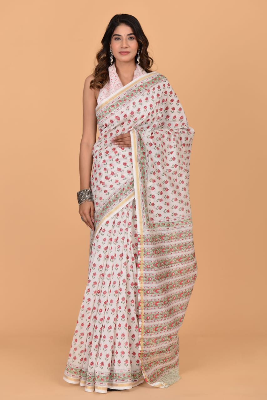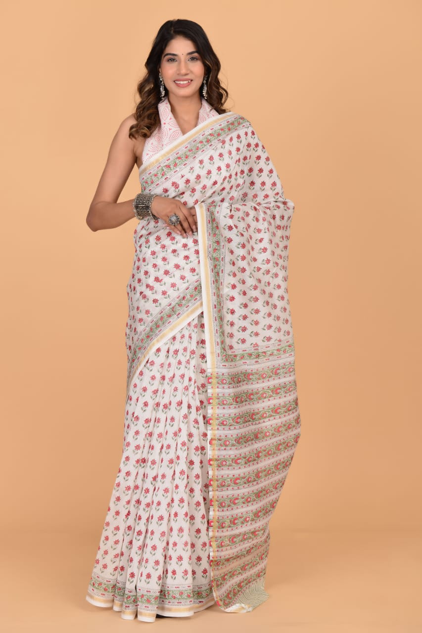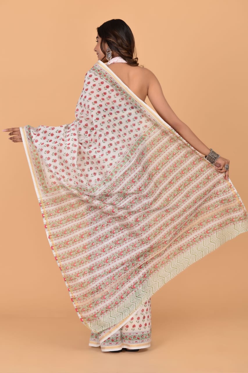 Anvi White Chanderi Silk Indian Printed Saree Hand Block Floral Print with Unstitched Blouse