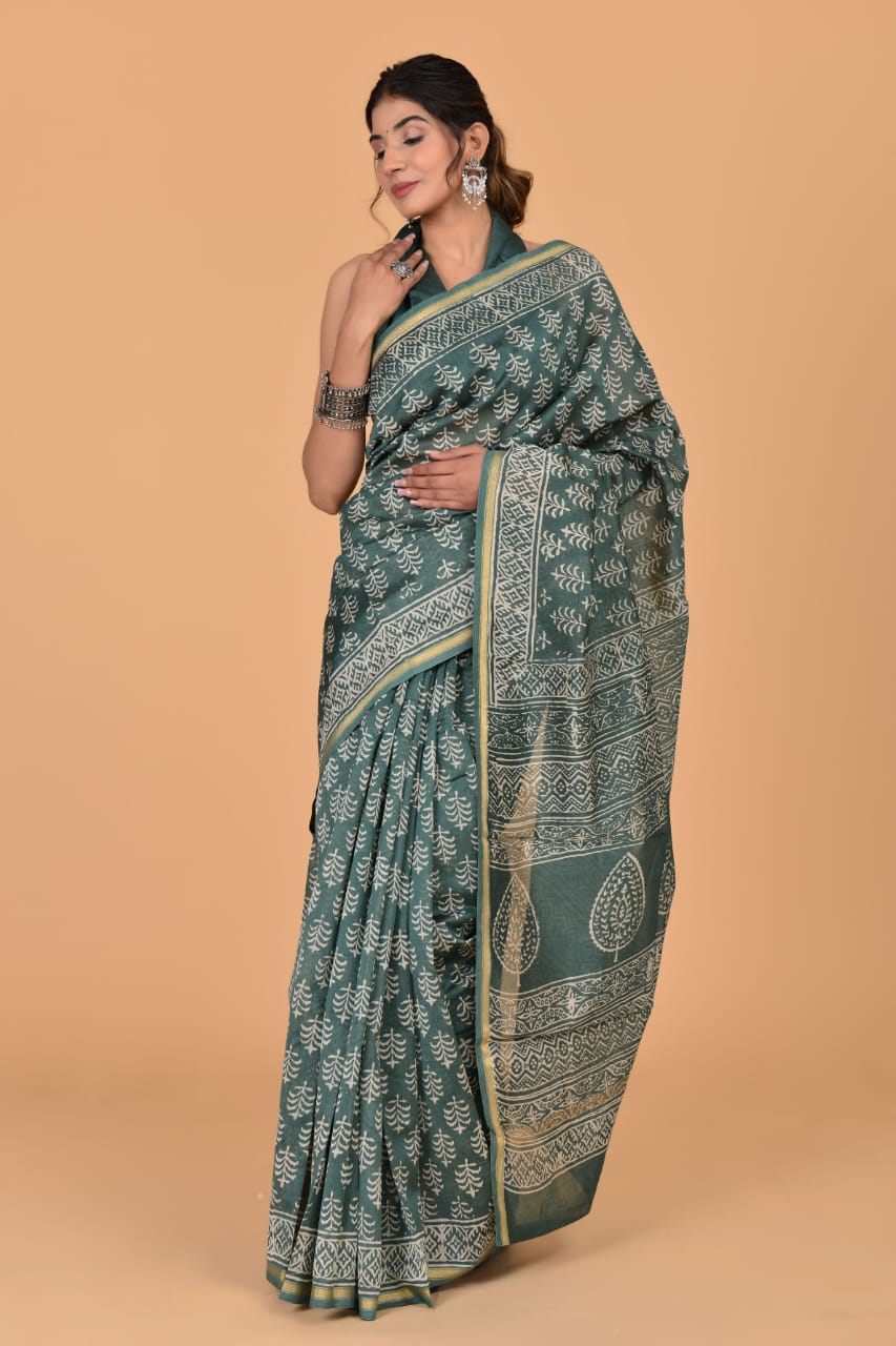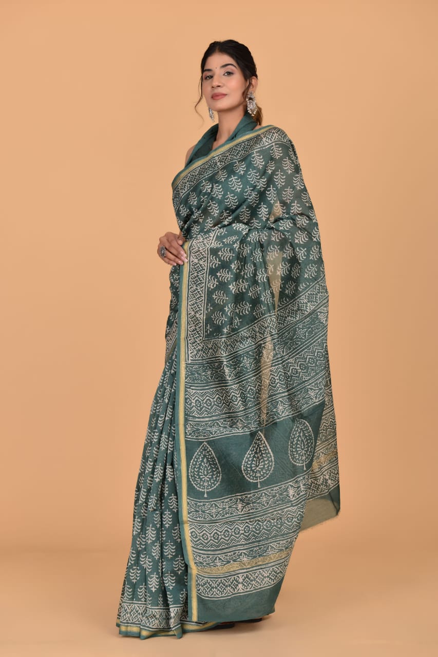 Saloni Grey Chanderi Silk Bangla Printed Saree Hand Block Print with Unstitched Blouse