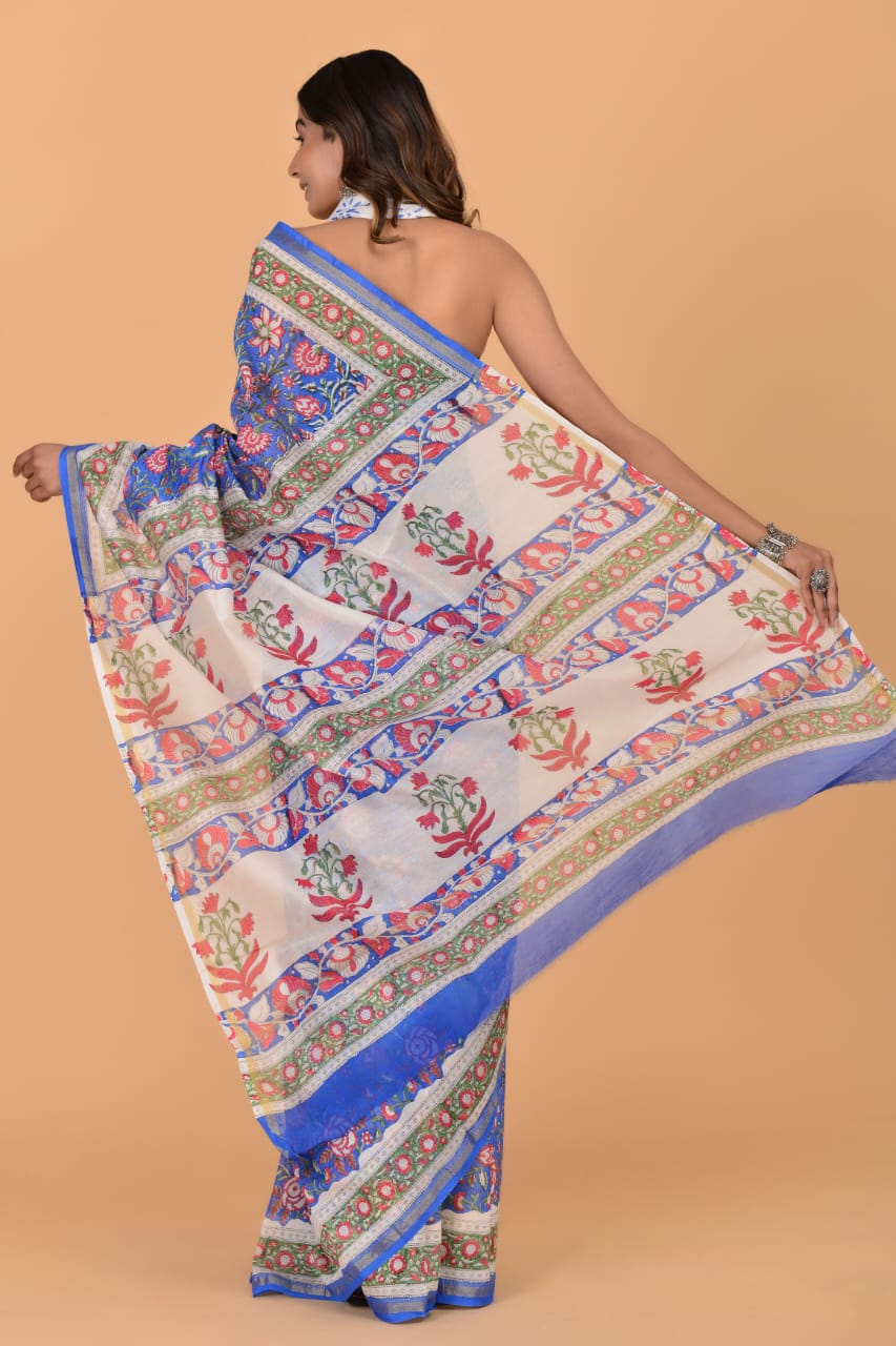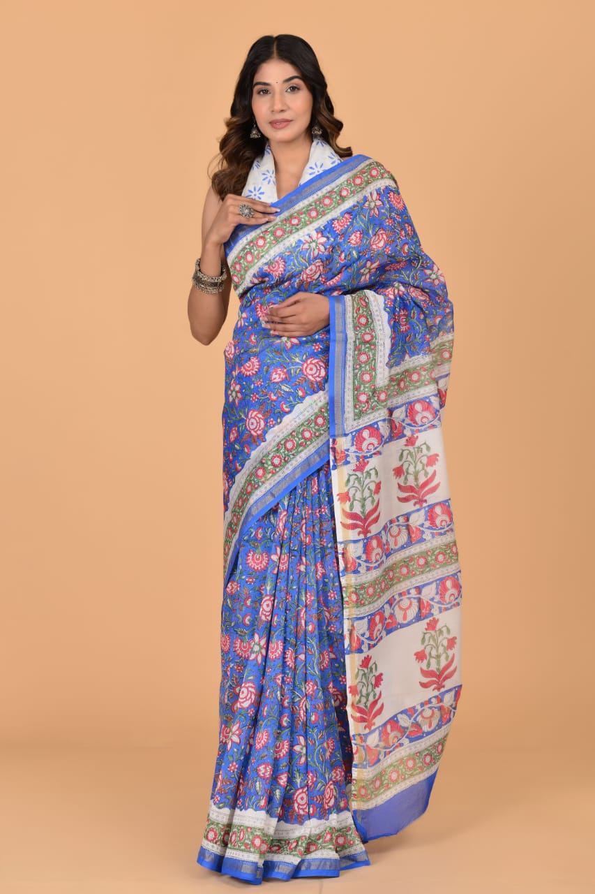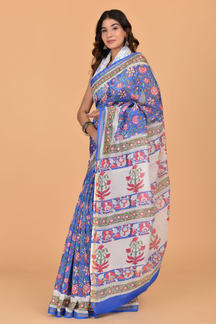 Rimi Blue Chanderi Silk Indian Floral Printed Saree Hand Block Print with Unstitched Blouse