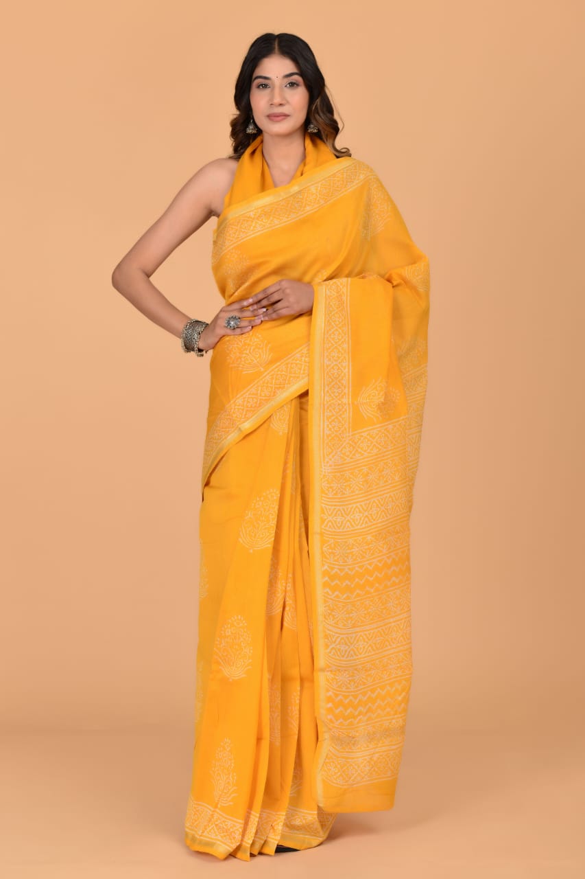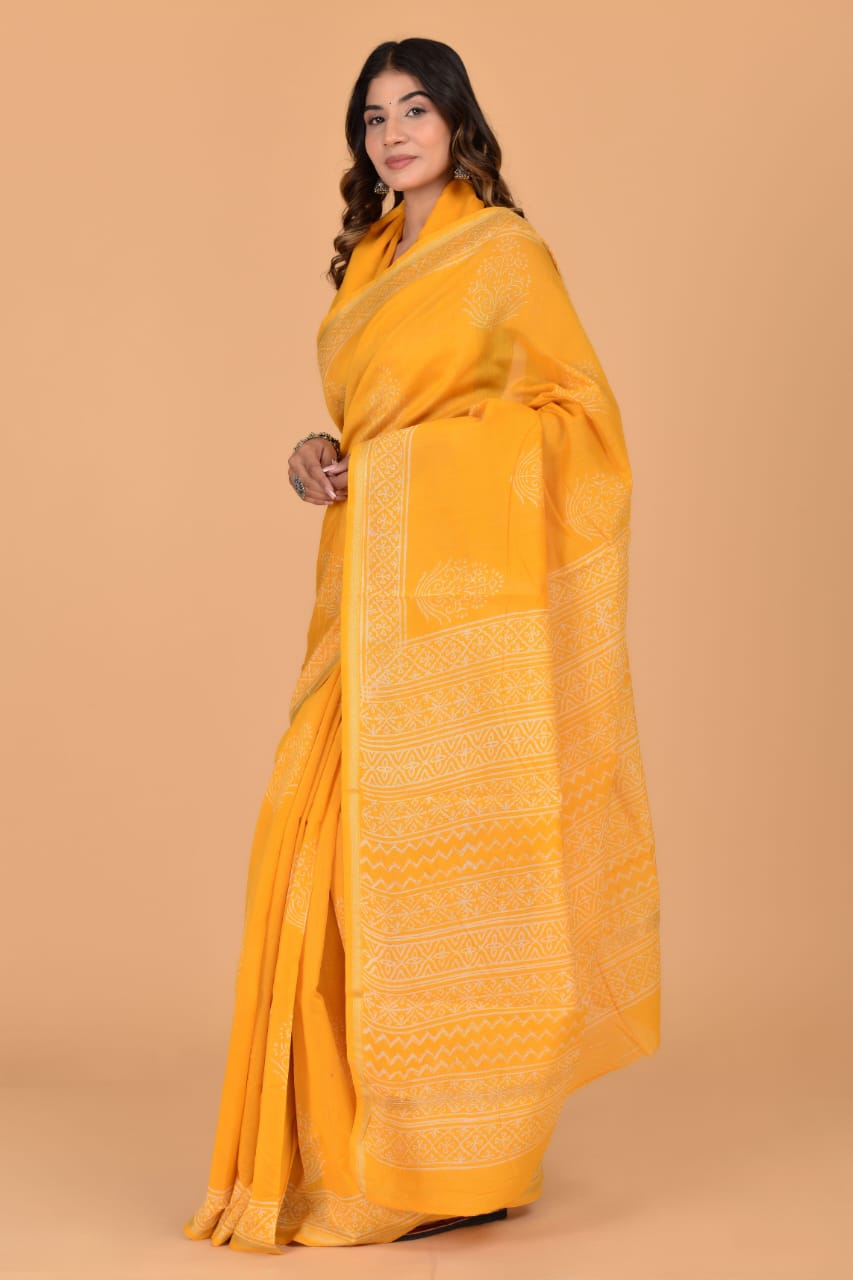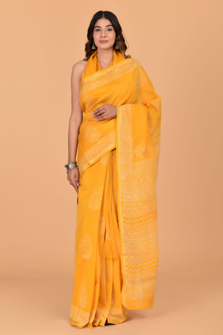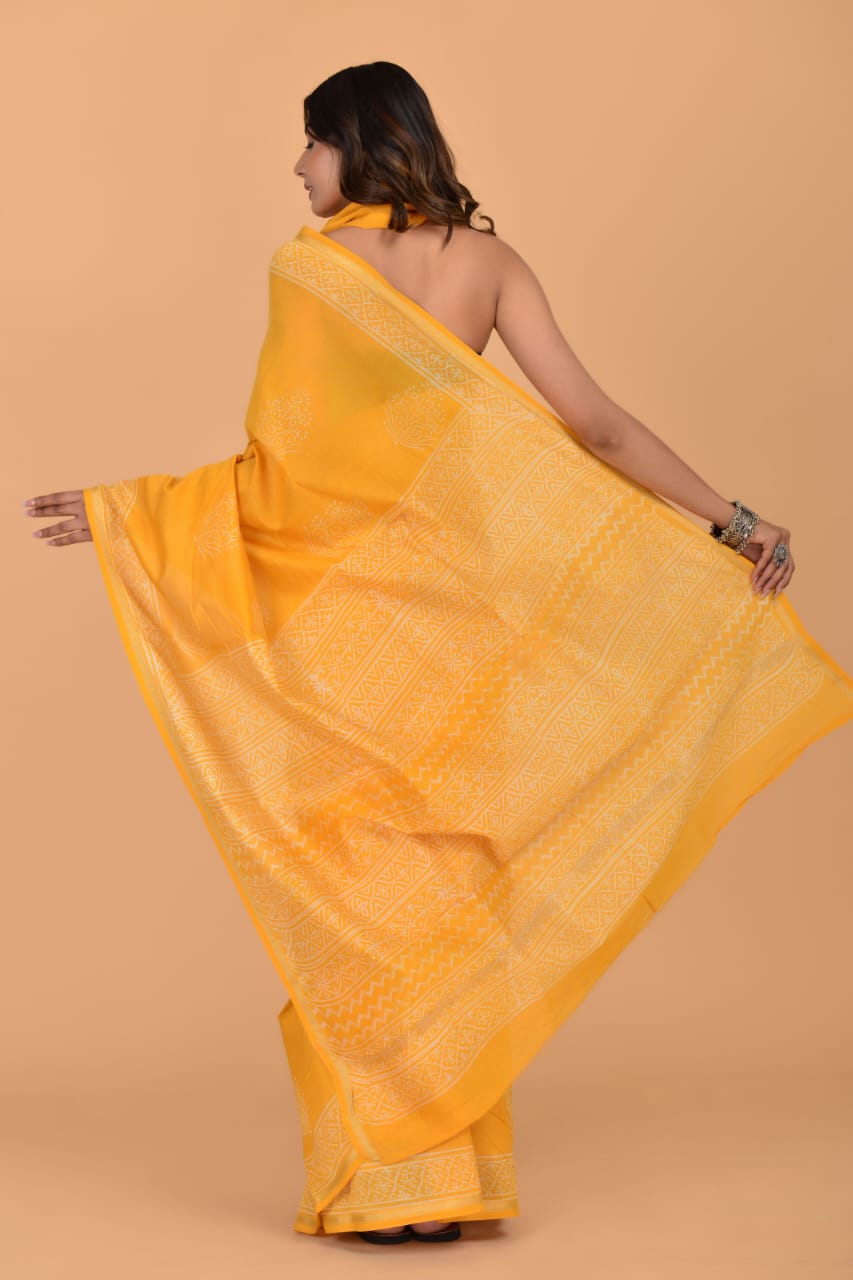 Poorva Yellow Chanderi Silk Indian Printed Saree Hand Block Print with Unstitched Blouse
