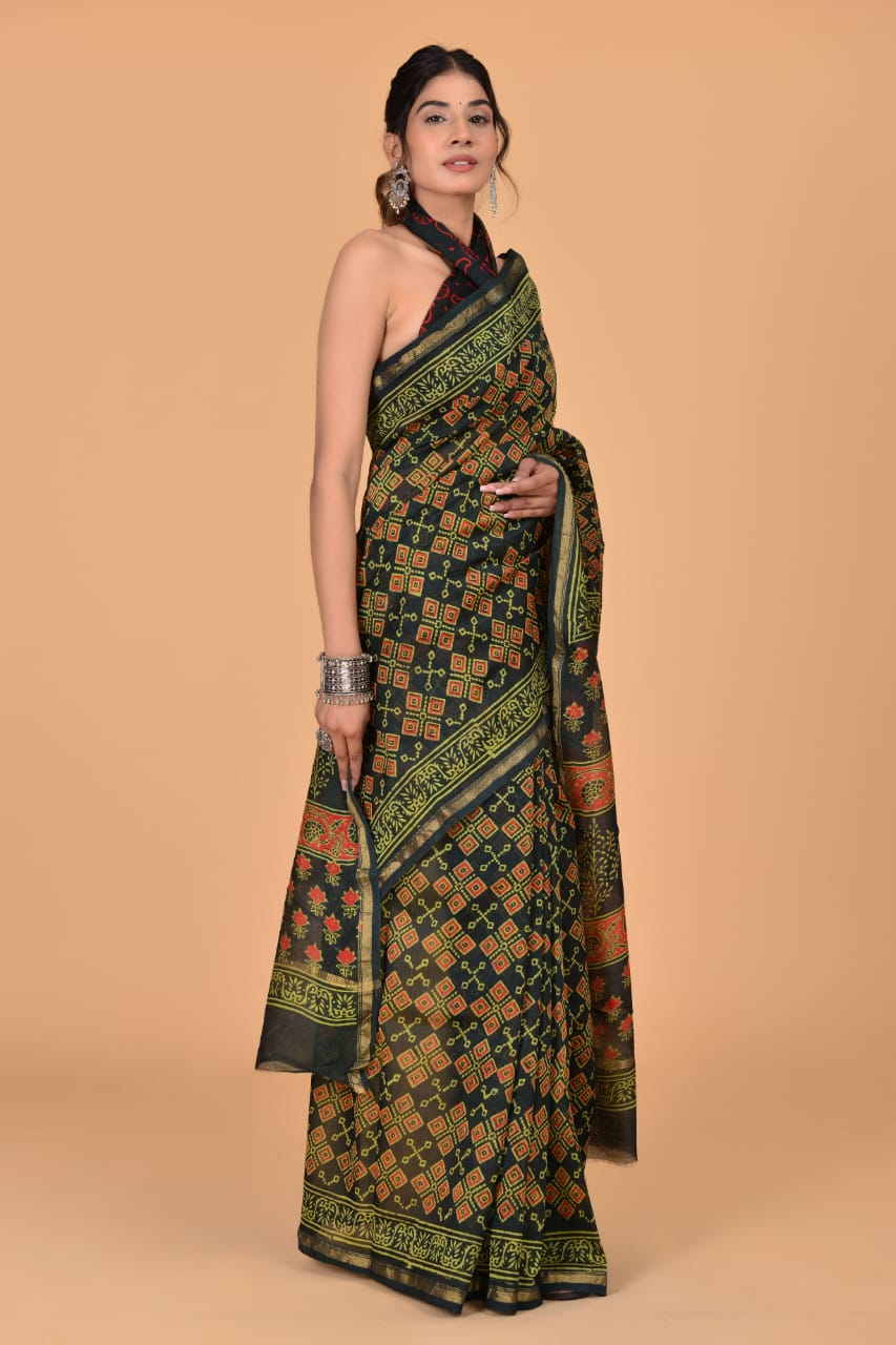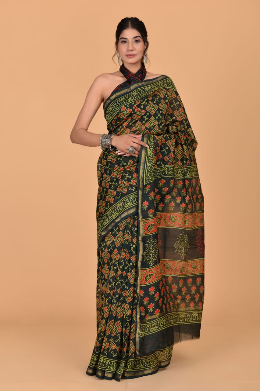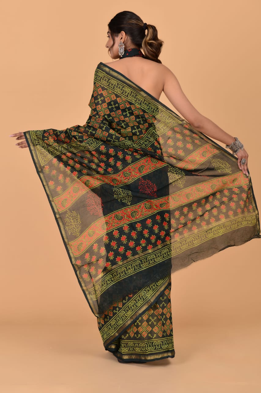 Hifza Black Green Designer Chanderi Silk Hand Block Print Saree with Unstitched Blouse Piece