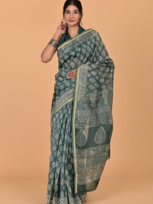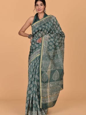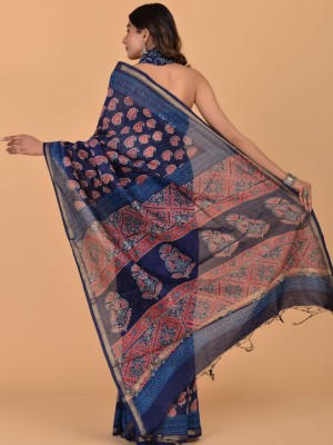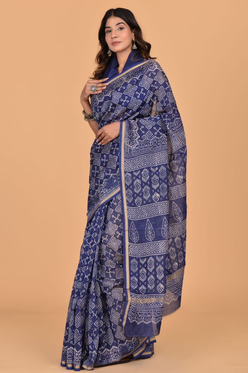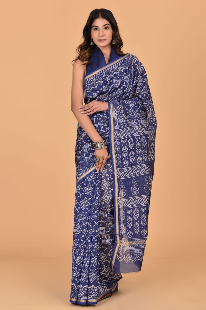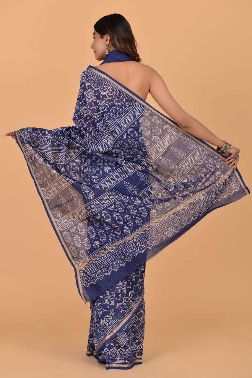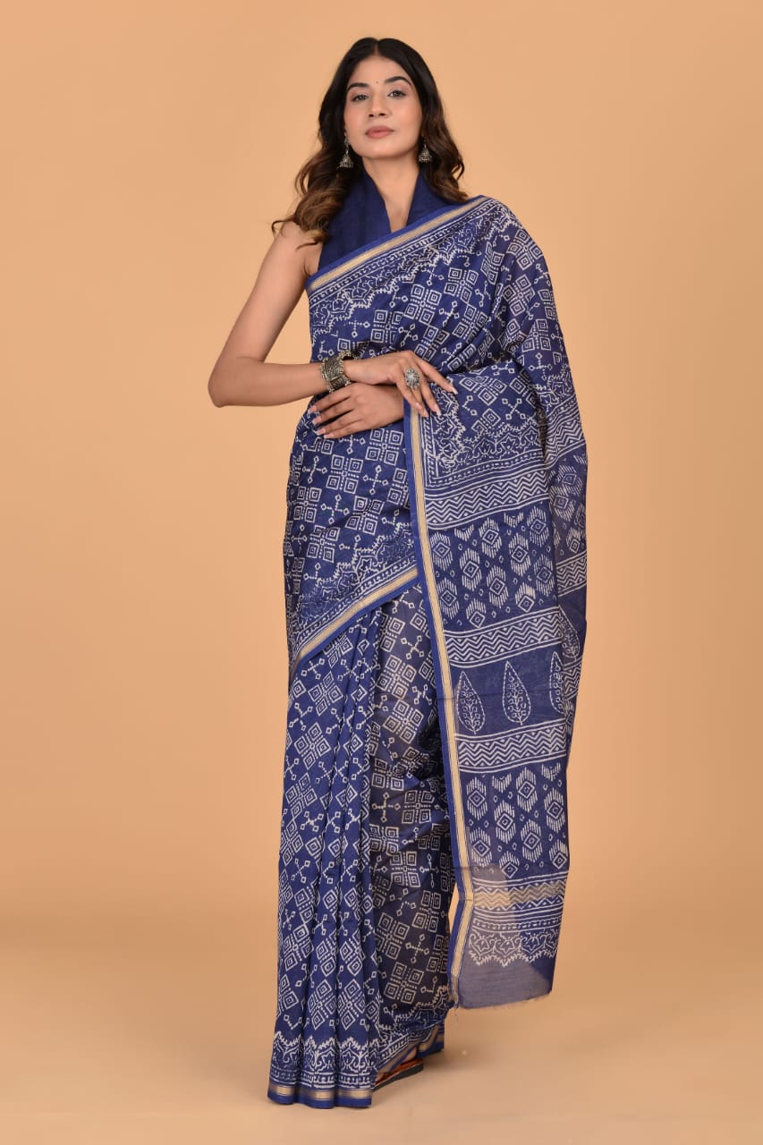 Vibha Blue Traditional Chanderi Silk Saree - Indian Hand Block Print with Unstitched Blouse