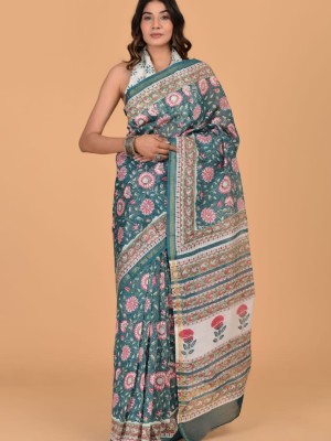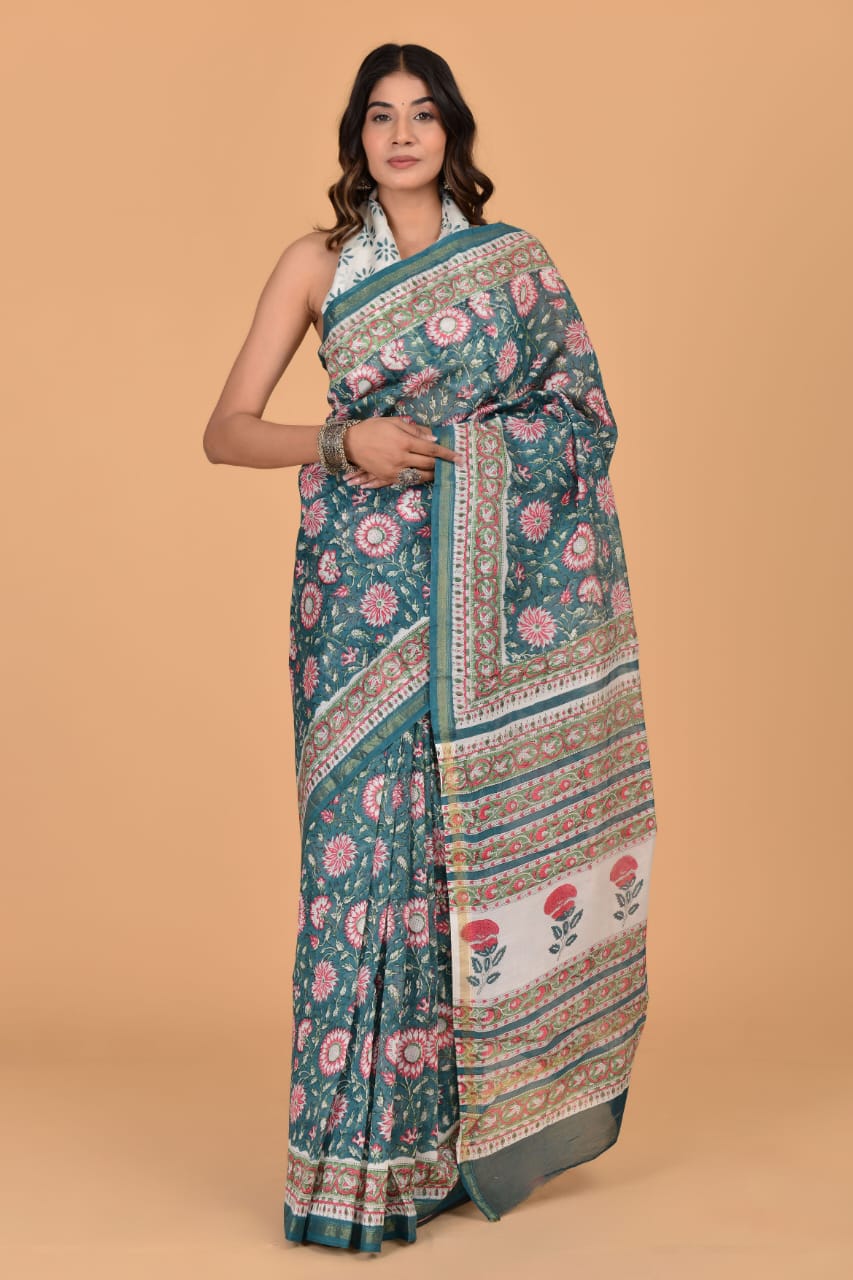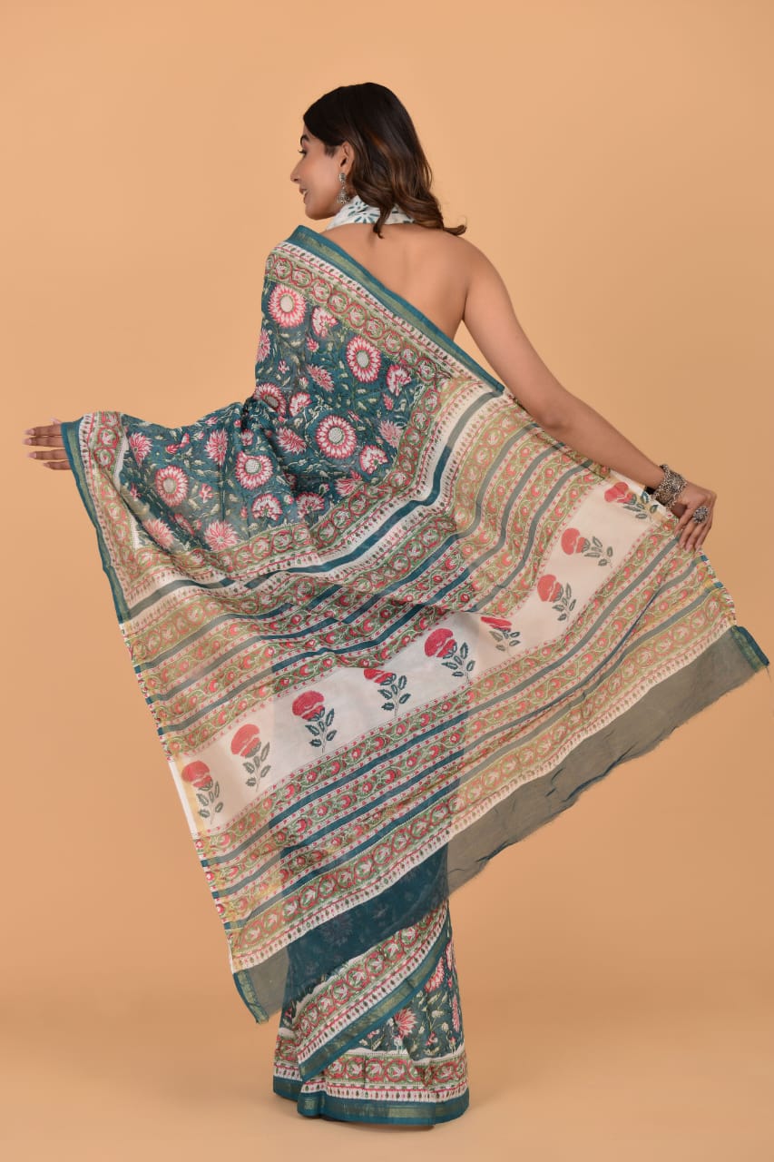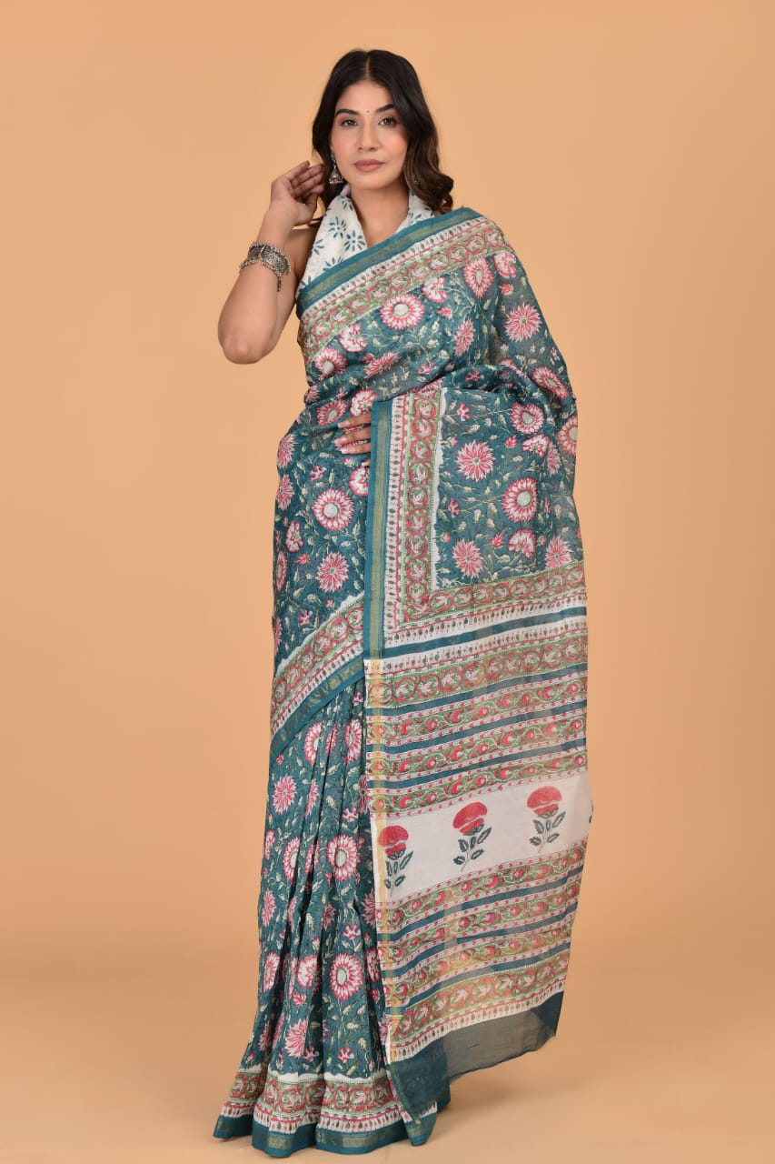 Usha Grey Traditional Chanderi Silk Saree - Indian Hand Block Floral Print with Unstitched Blouse