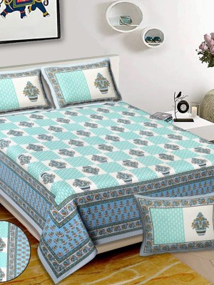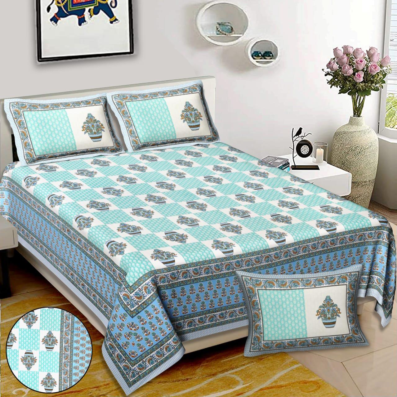 • Blue Floral Luxury Cotton Printed Bed Sheet with 2 Pillow Covers - for King Size Bed