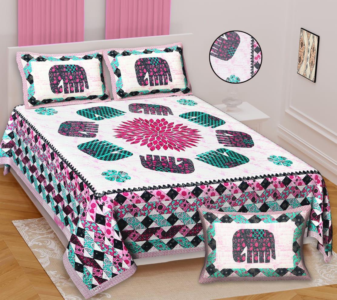 • Elephant Rajasthani Jaipuri Royal Print Cotton Printed Bed Sheet with 2 Pillow Covers - for King Size Bed