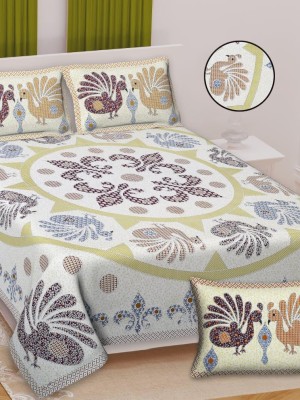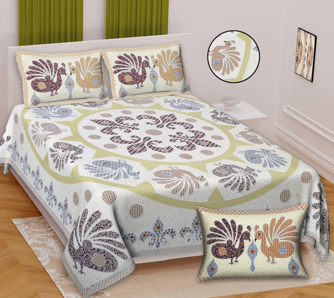 • Peacock Rajasthani Jaipuri Royal Print Cotton Multi Color Printed Bed Sheet with 2 Pillow Covers - for King Size Bed