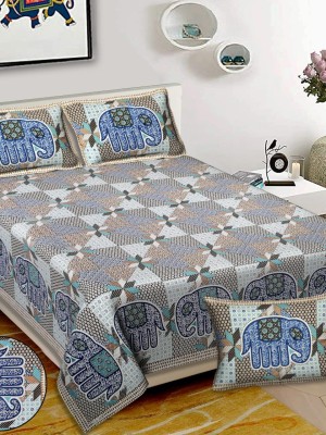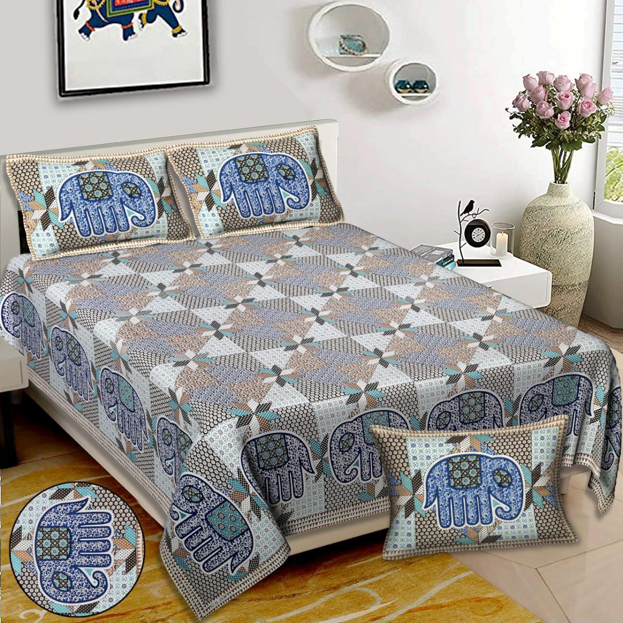 Elephant Floral Royal Print Cotton Multi Color Printed Bed Sheet with 2 Pillow Covers - for King Size Bed