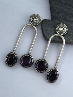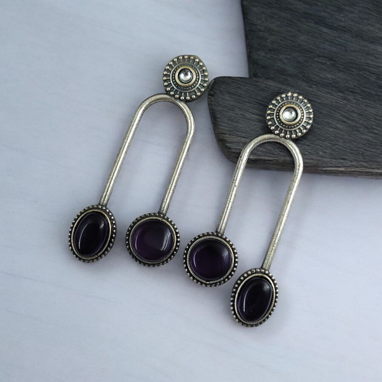 Amethyst Ethnic Monalisa Stone Silver Oxidised Brass Drop Stud Earring Jewelry for Women