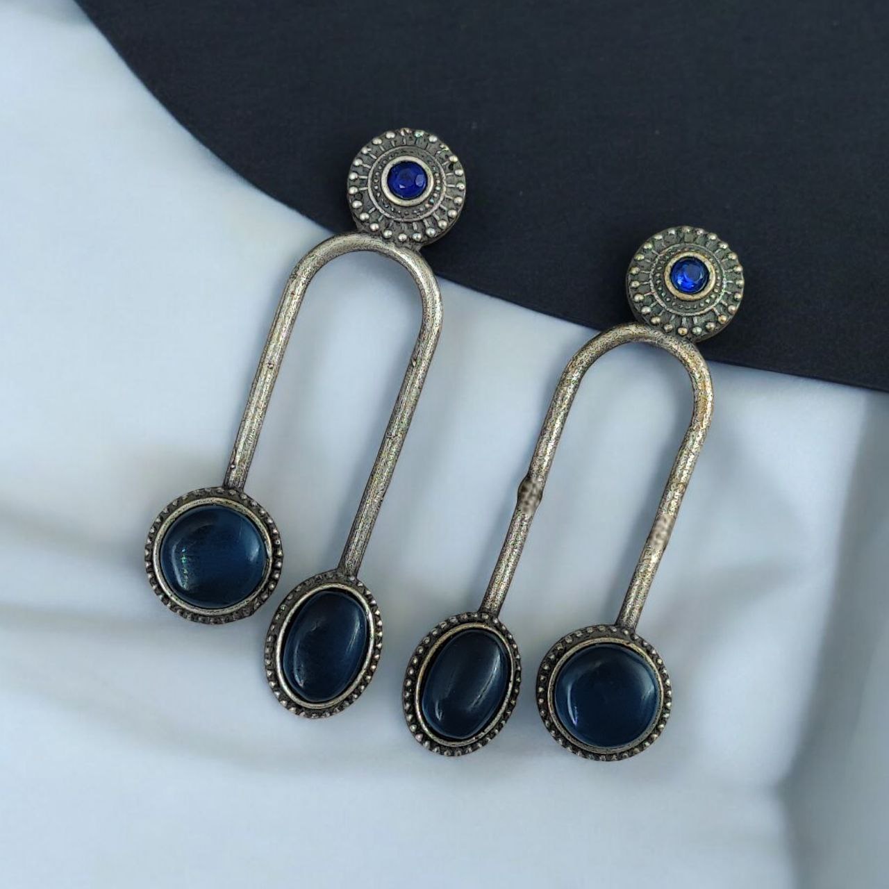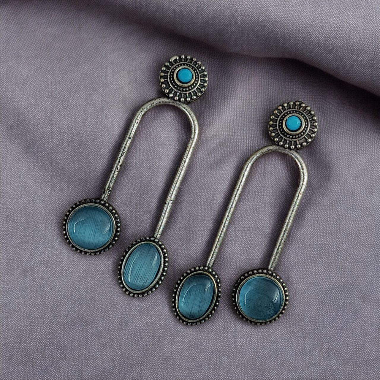 Blue Ethnic Monalisa Stone Silver Oxidised Brass Drop Stud Earring Jewelry for Women
