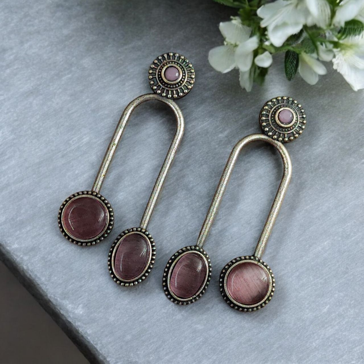 Babypink Ethnic Monalisa Stone Silver Oxidised Brass Drop Stud Earring Jewelry for Women