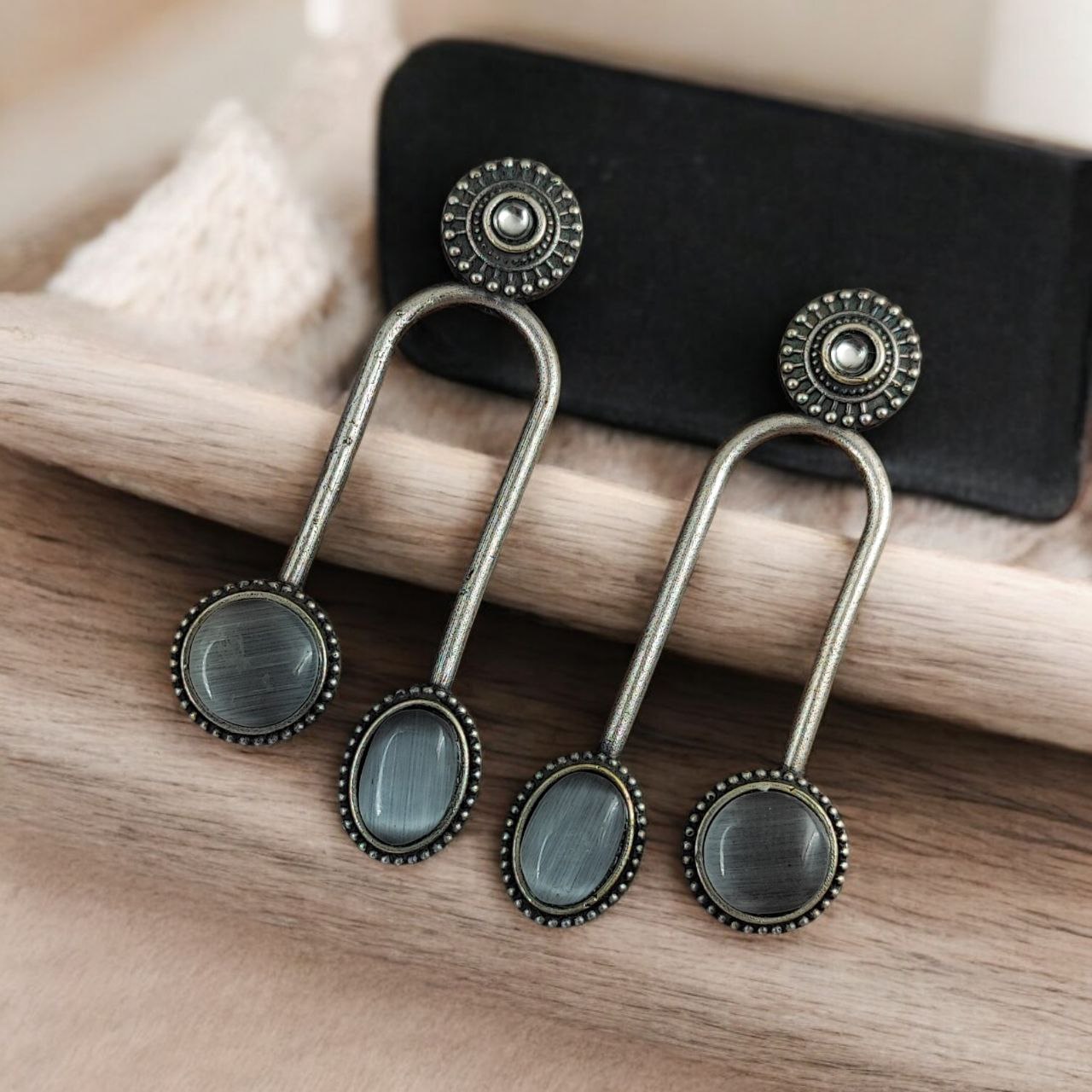 Grey Ethnic Monalisa Stone Silver Oxidised Brass Drop Stud Earring Jewelry for Women