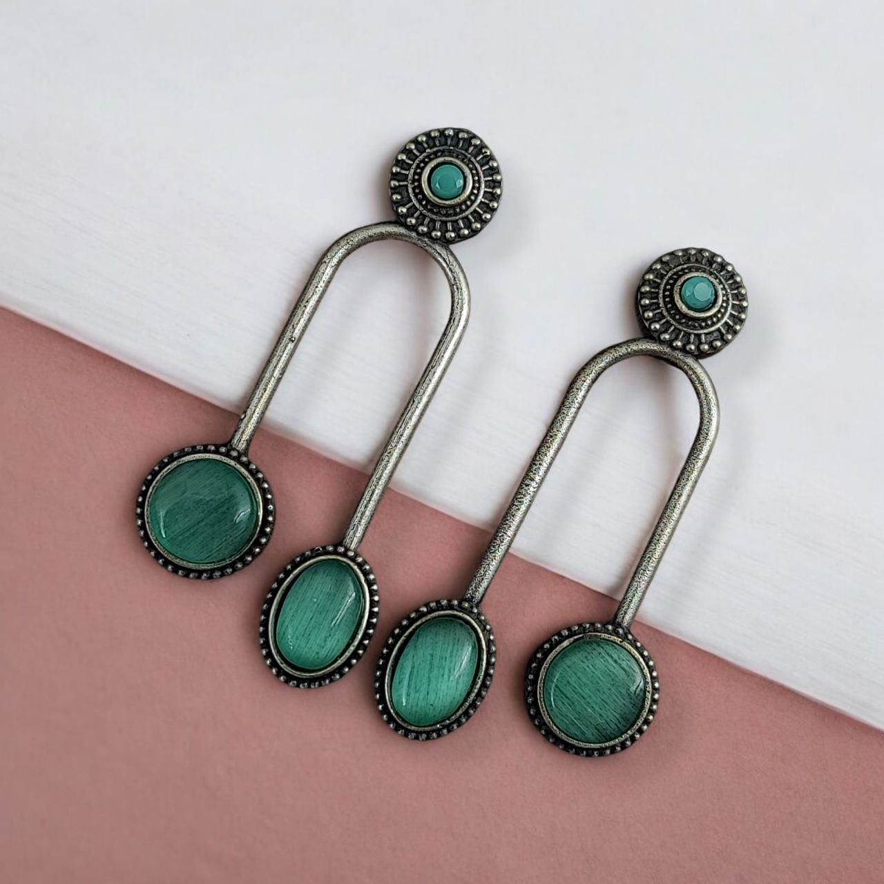 Aqua Ethnic Monalisa Stone Silver Oxidised Brass Drop Stud Earring Jewelry for Women