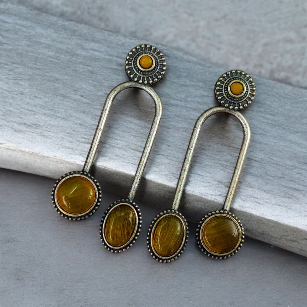Yellow Ethnic Monalisa Stone Silver Oxidised Brass Drop Stud Earring Jewelry for Women