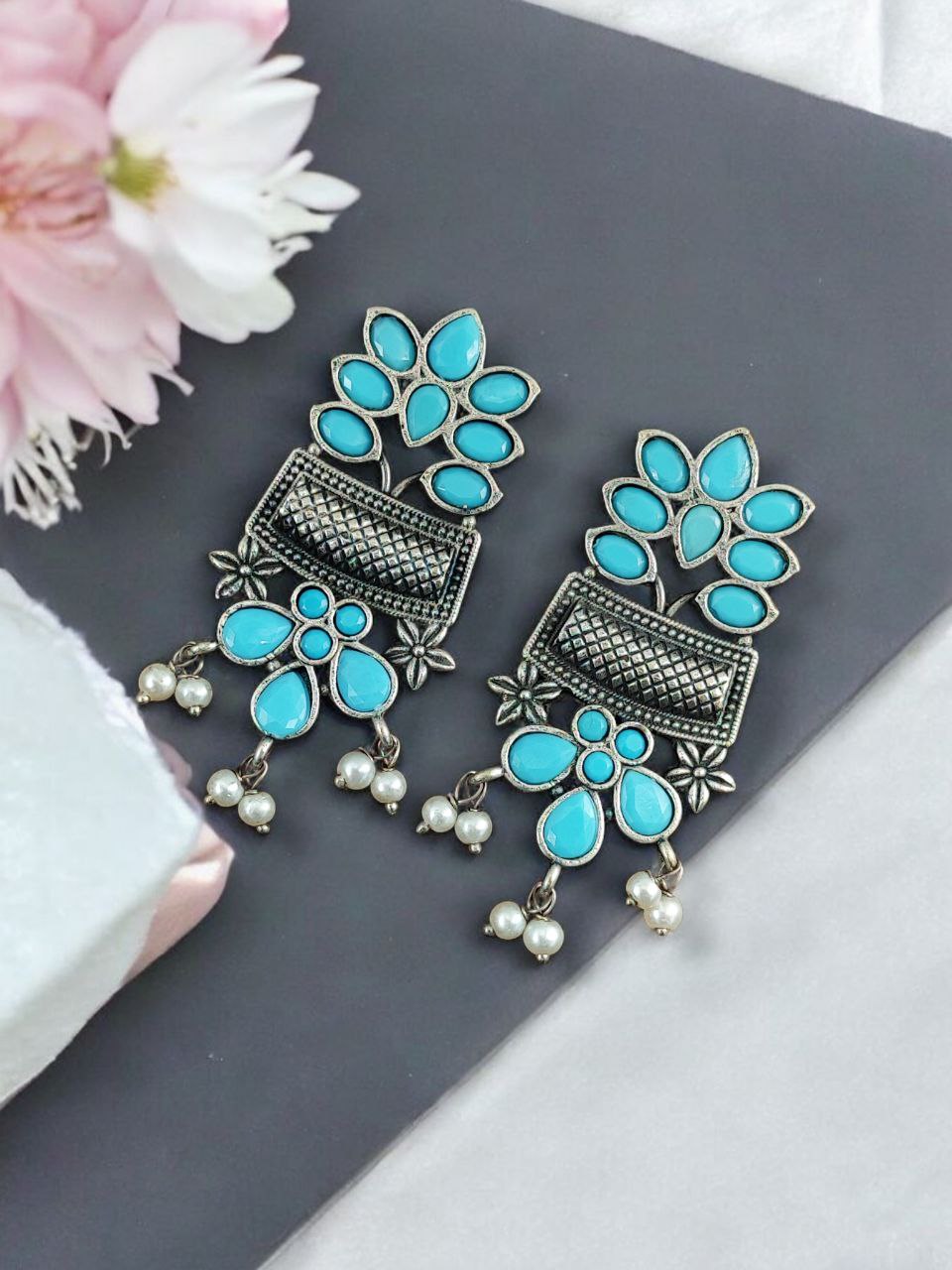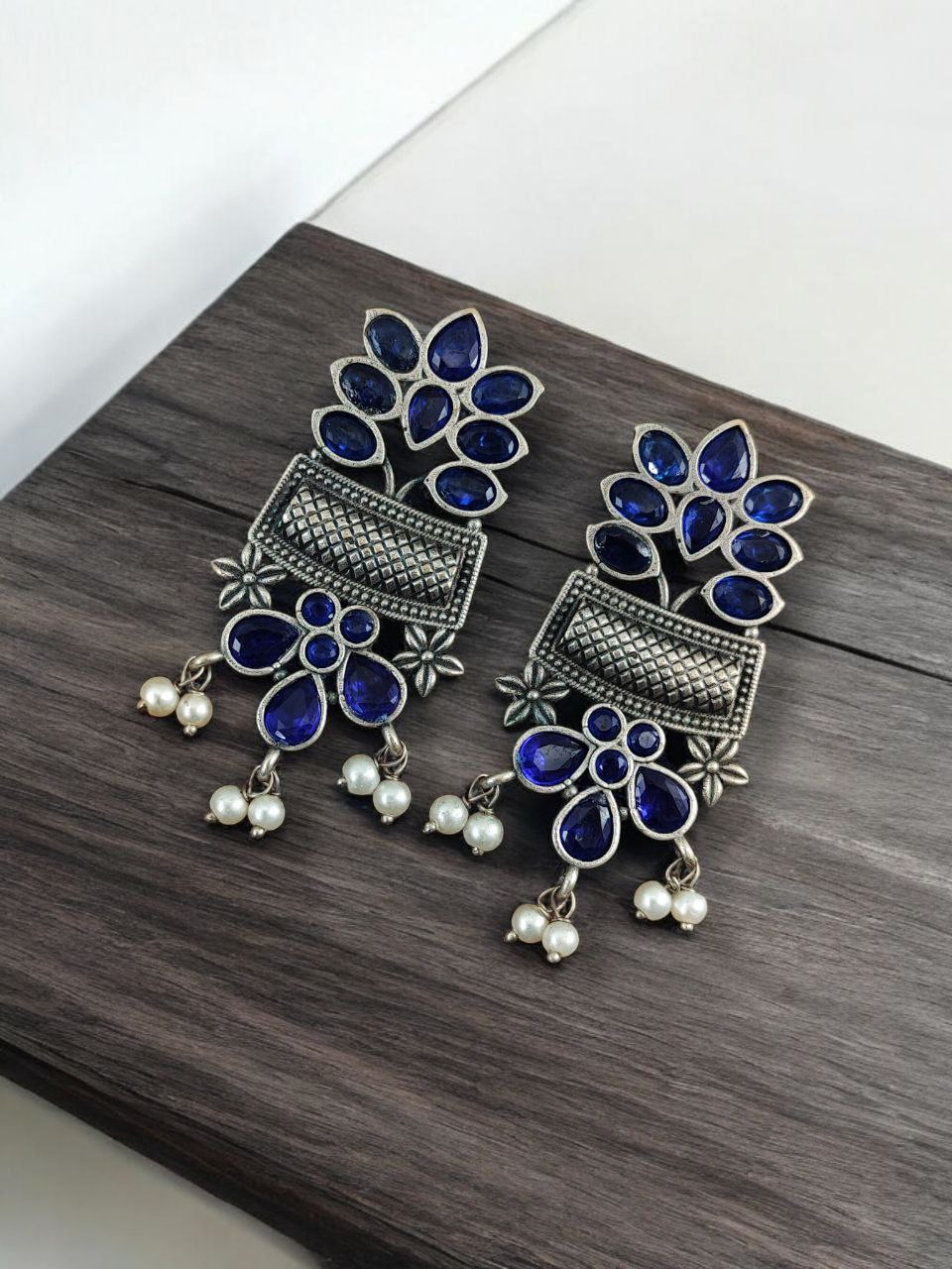 Blue Elegant Designer Dangler Silver Oxidised Stud Earrings Pearls Drop Gypsy Jewelry for Girls