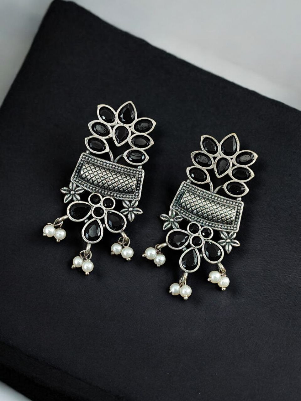 Black Elegant Designer Dangler Silver Oxidised Stud Earrings Pearls Drop Gypsy Jewelry for Girls