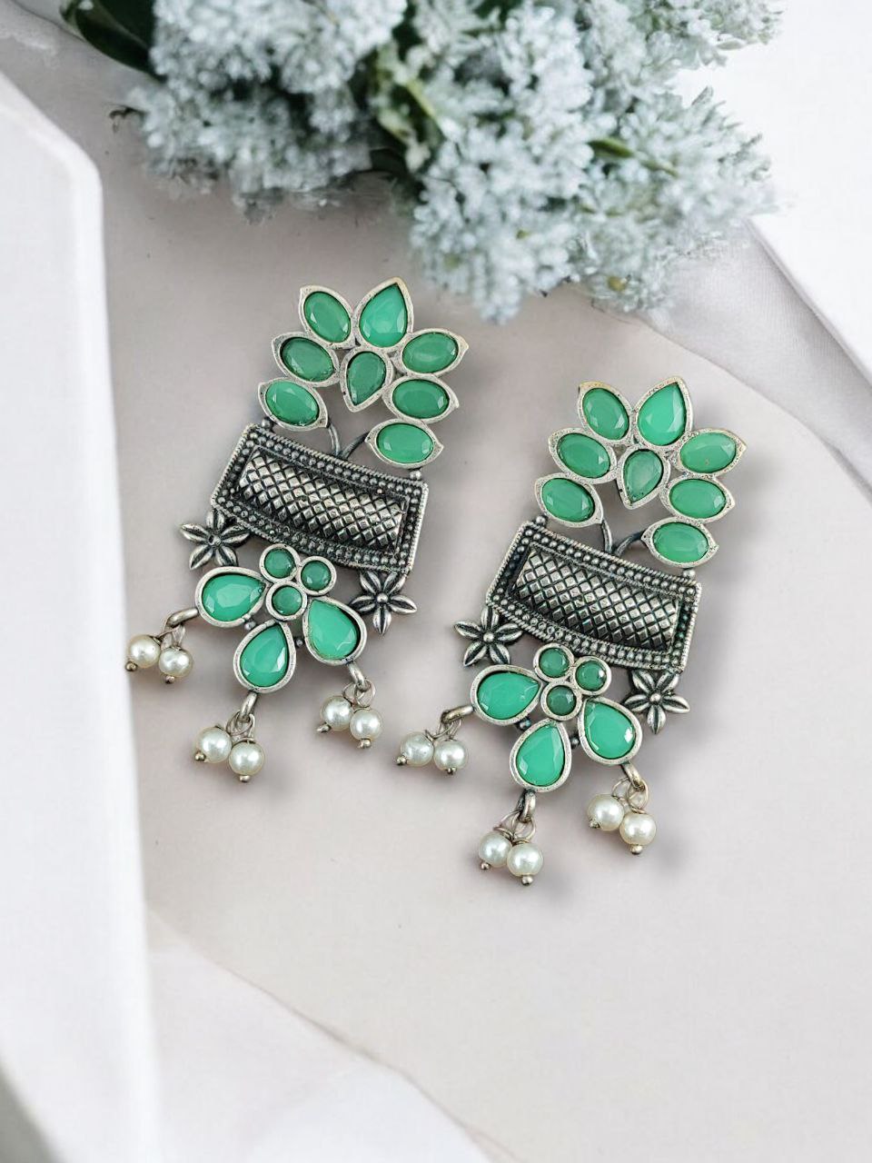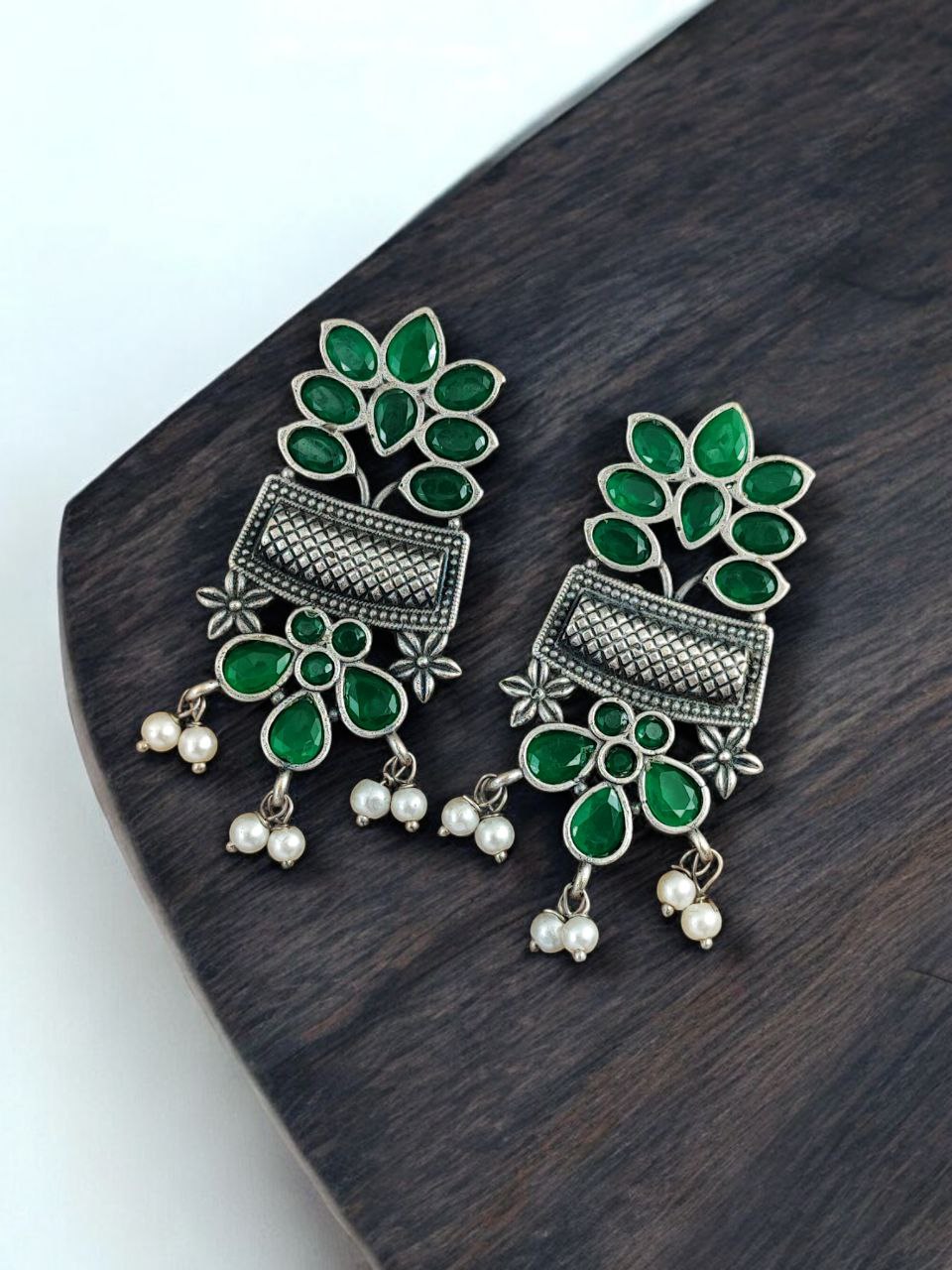 Green Elegant Designer Dangler Silver Oxidised Stud Earrings Pearls Drop Gypsy Jewelry for Girls