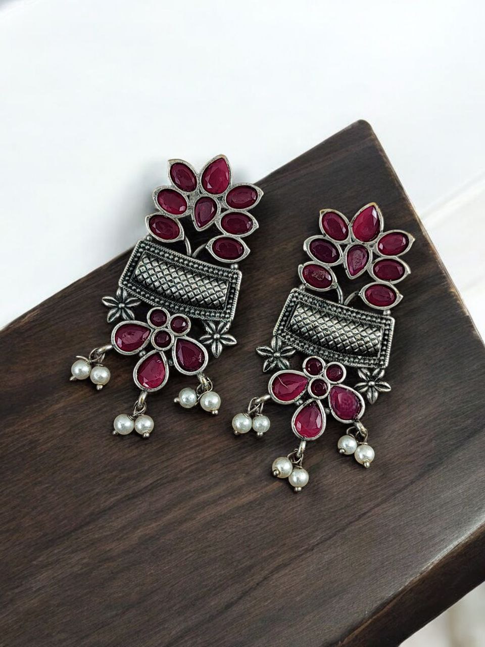 Red Elegant Designer Dangler Silver Oxidised Stud Earrings Pearls Drop Gypsy Jewelry for Girls