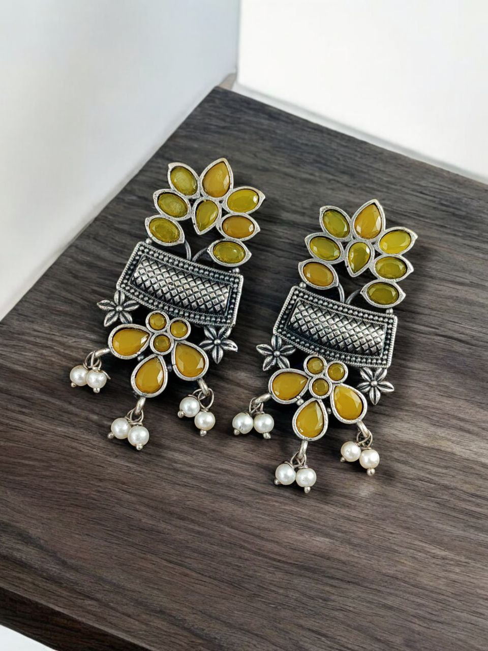 Yellow Elegant Designer Dangler Silver Oxidised Stud Earrings Pearls Drop Gypsy Jewelry for Girls