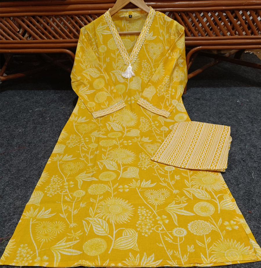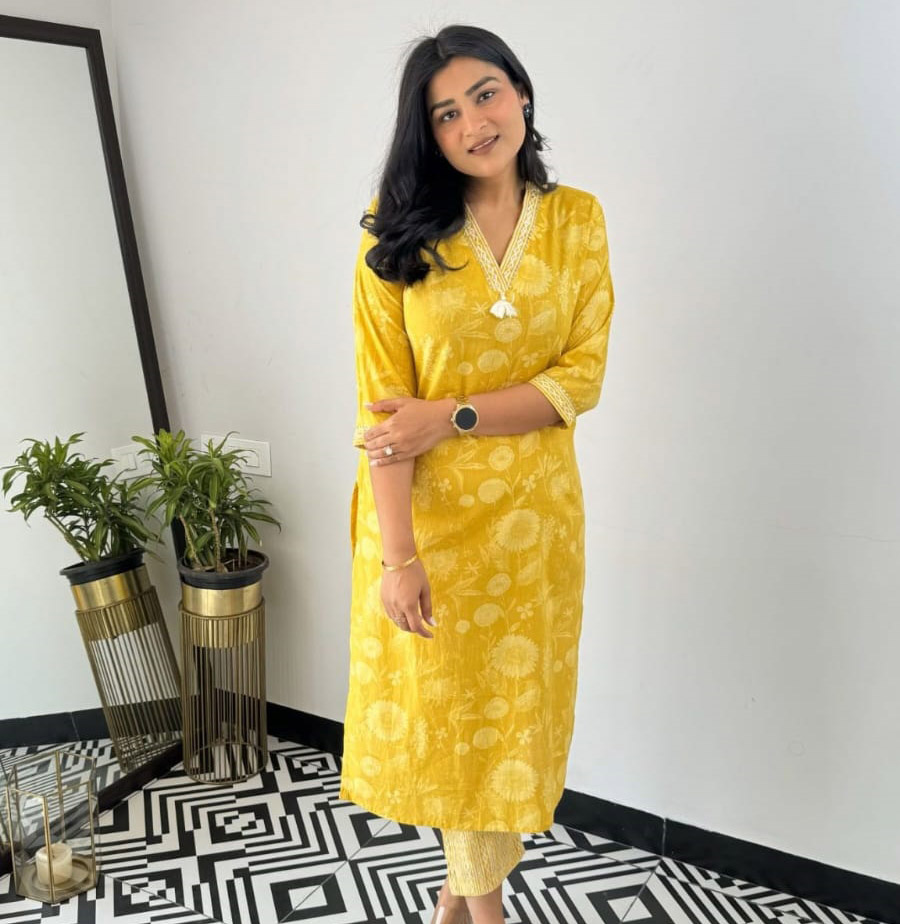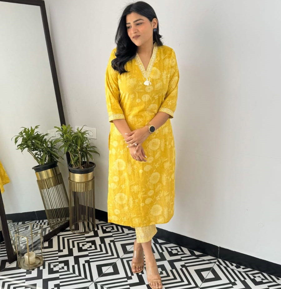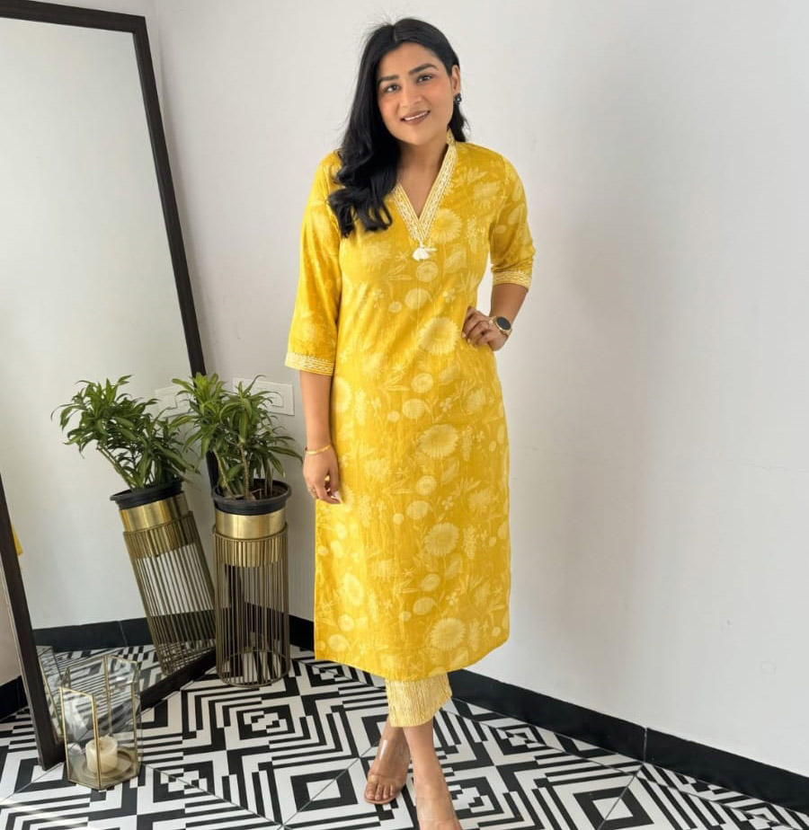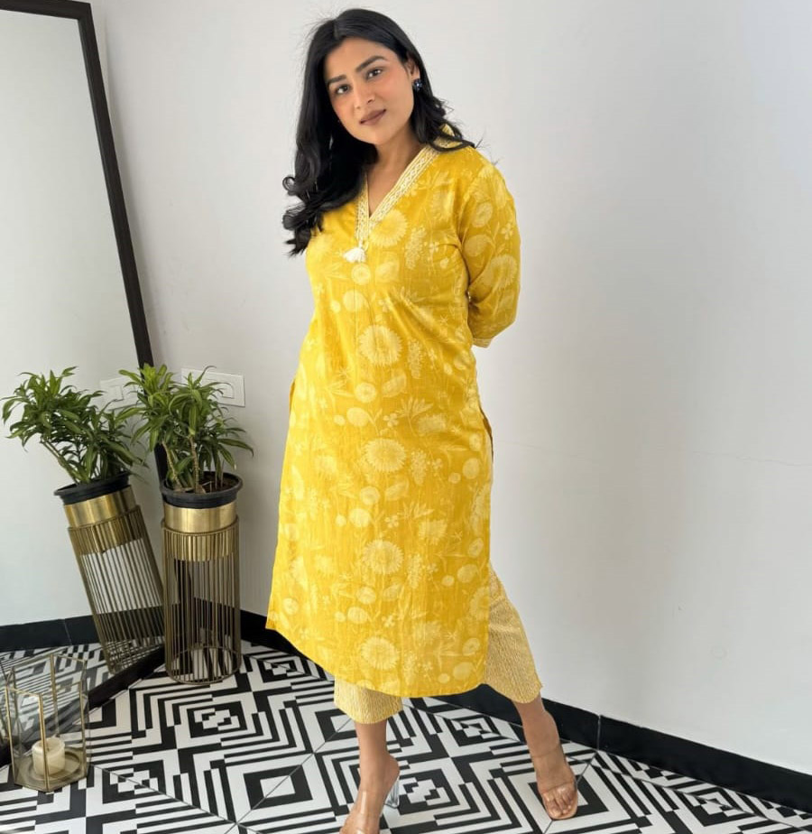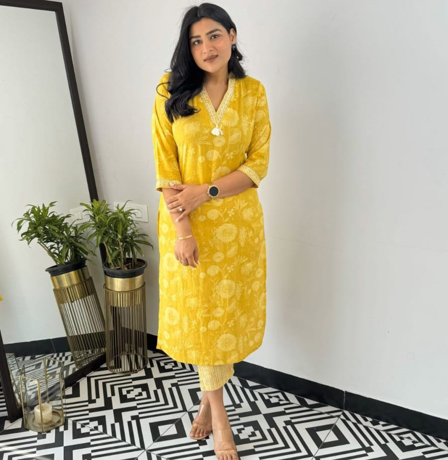Brighten up your wardrobe with our Yellow Floral V-Neck Straight Salwar Kameez Kurti Pant Set. This Indian traditional ensemble features a beautiful V-neck kurti adorned with vibrant floral prints, exuding a lively and elegant appeal. The straight-cut silhouette ensures a flattering fit, while the soft and breathable fabric keeps you comfortable throughout the day. Paired with matching pants, this set is perfect for festive occasions, casual outings, or office wear. The charming floral design and cheerful yellow hue bring a touch of freshness to your look. Style it with ethnic jewelry and sandals to complete your effortless, elegant appearance.