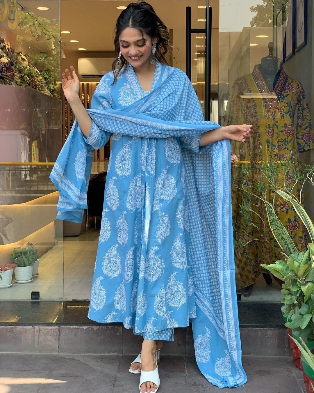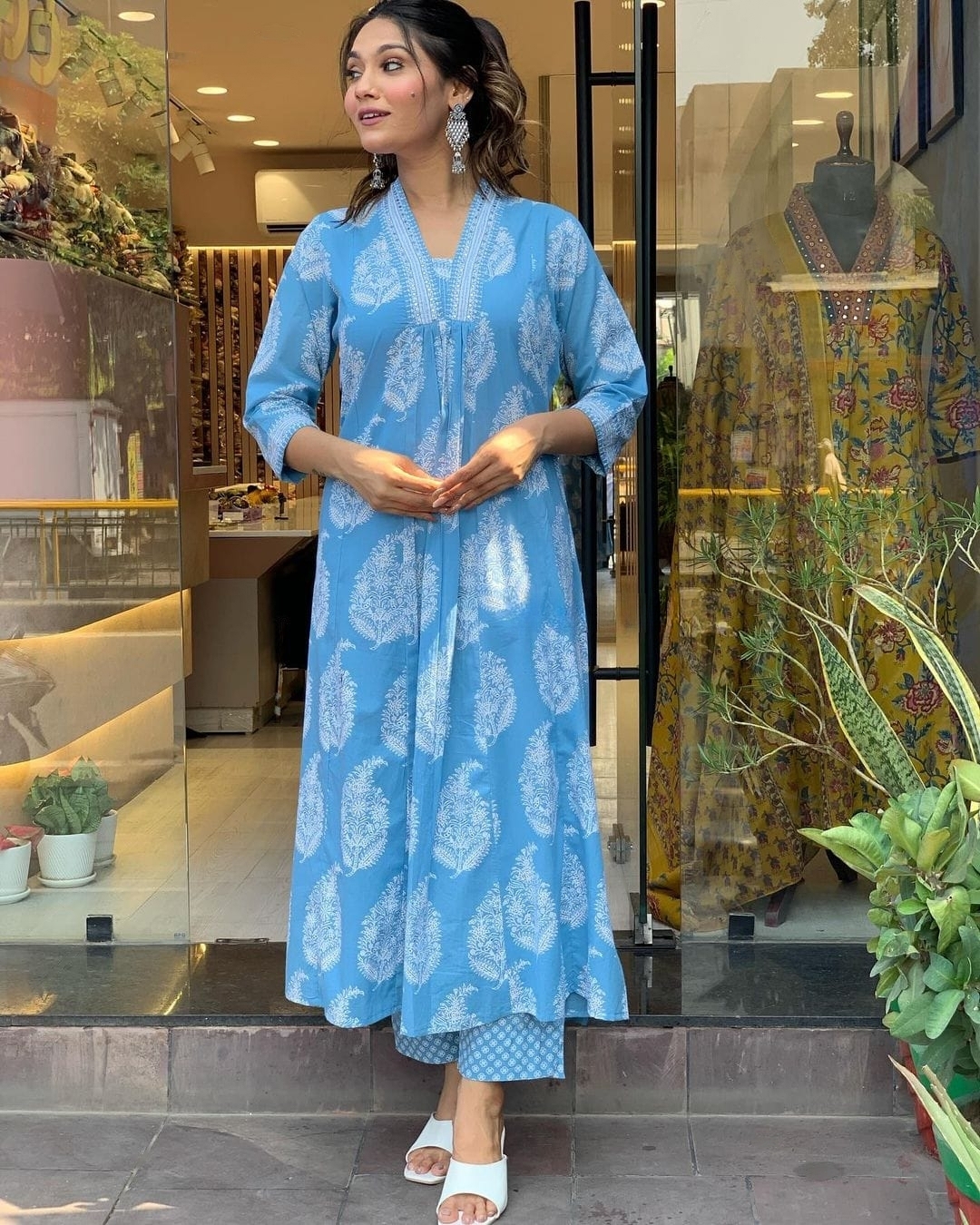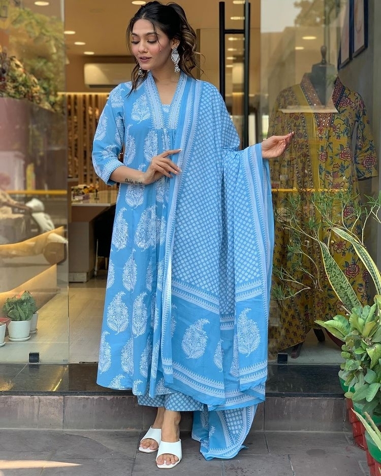 Enhance your ethnic style with our Blue Cotton Floral Printed V-Neck Kurti Pant Dupatta Set. This beautiful Indian salwar kameez features a vibrant floral print on soft, breathable cotton fabric, offering elegance and comfort. The V-neck kurti is paired with matching pants for a flattering fit, while the lightweight dupatta completes the look with a touch of tradition. Perfect for festive occasions, casual outings, or work wear, this versatile set brings timeless charm to your wardrobe.