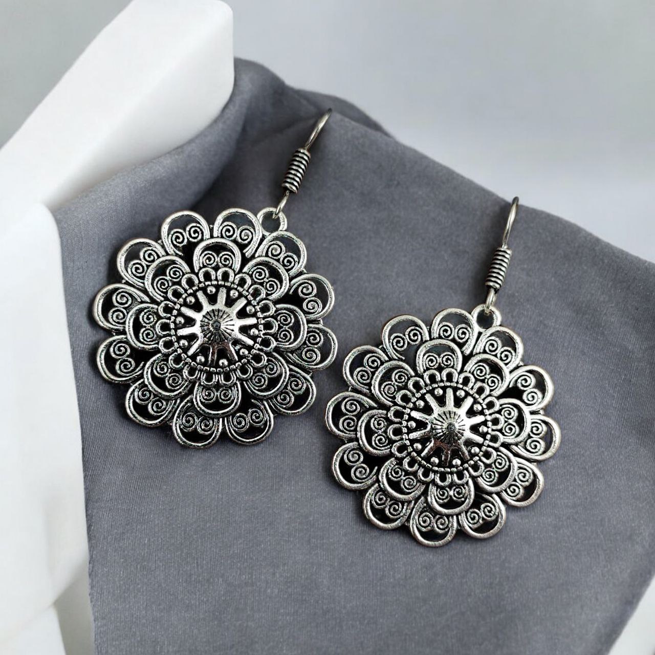 Round Mandala Bohochic Dangler Silver Oxidized Hook Earrings Jewelry for Girls
