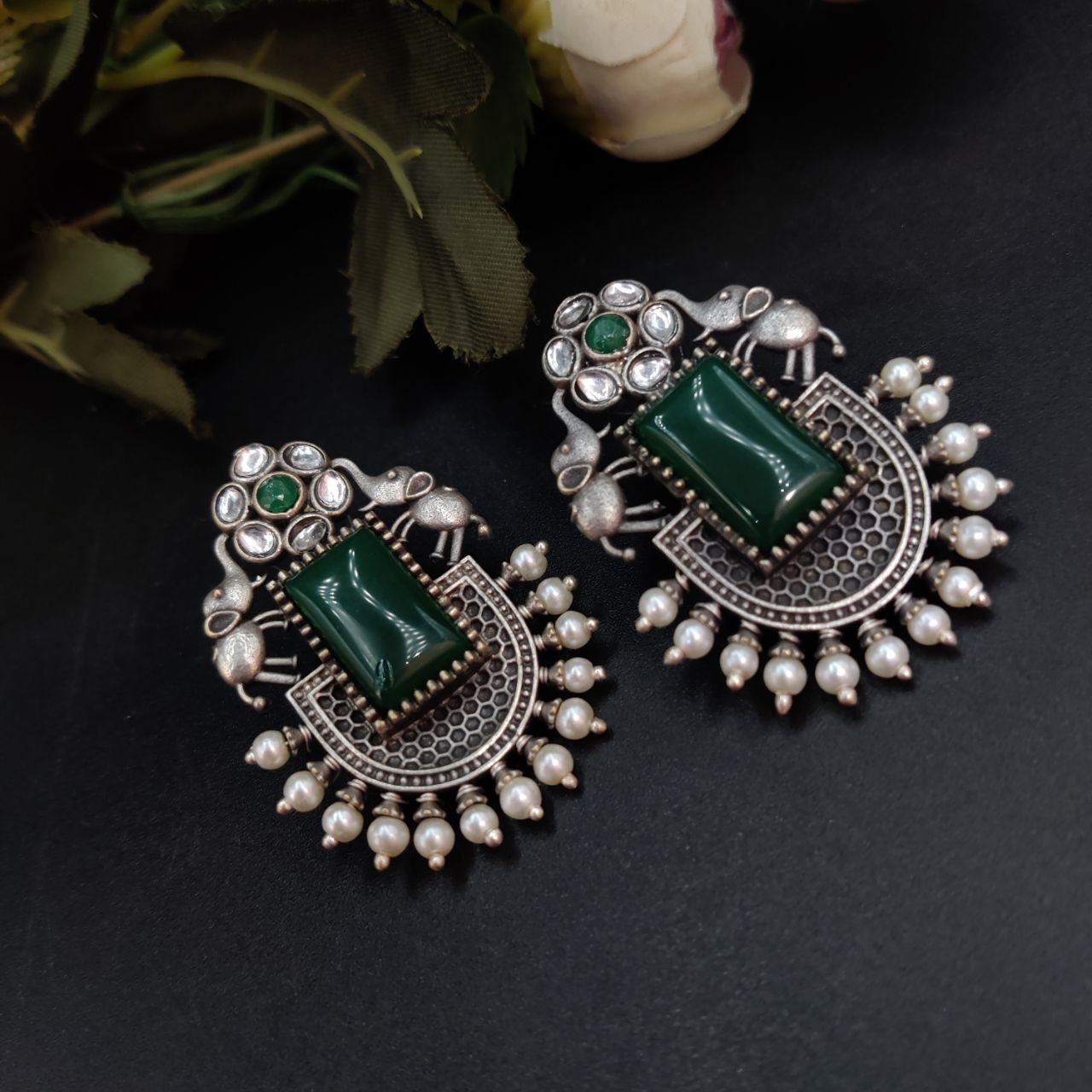 Green Bohemian Rustic Elephant Monalisa Stone Stud Earring Silver Oxidised Pearl Beads Earrings