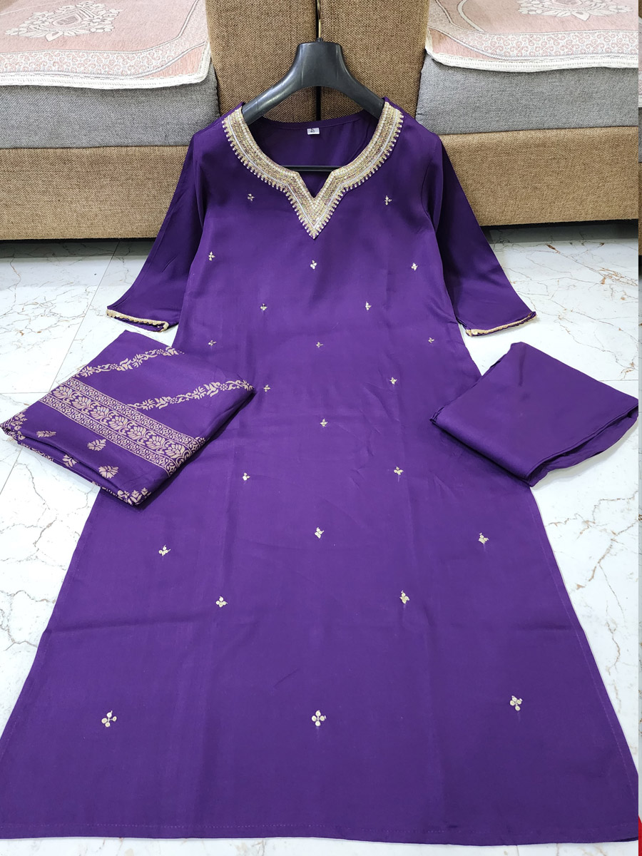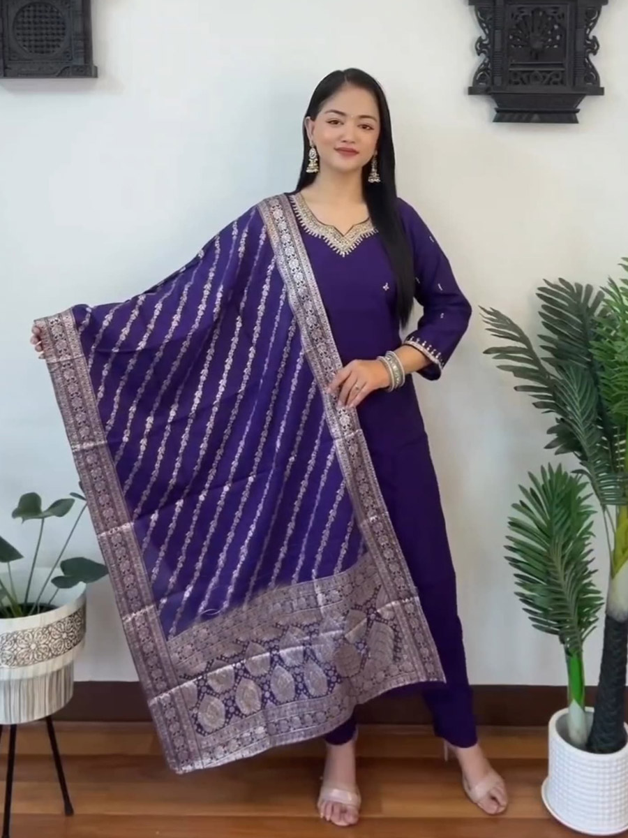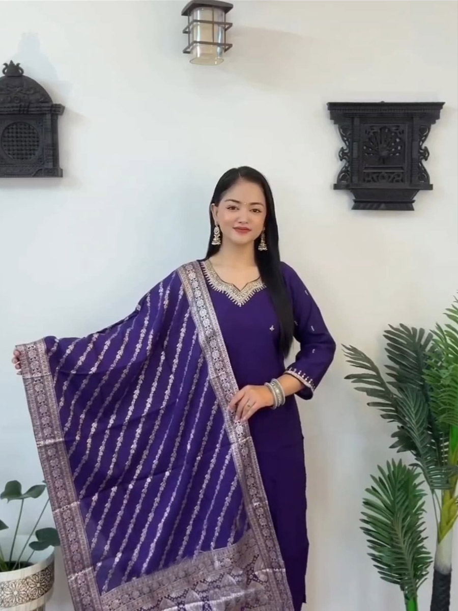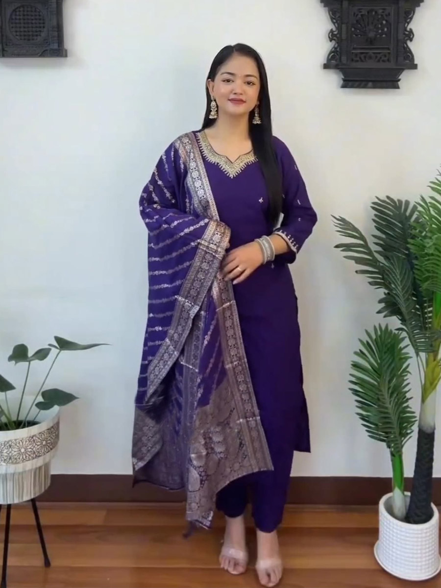 Elevate your ethnic wardrobe with this stunning Purple Traditional Rayon Straight Embroidered Salwar Kameez Suit Set. Crafted from premium quality rayon fabric, this ensemble offers both comfort and elegance, making it perfect for any occasion. The kurti features intricate embroidery work that adds a touch of sophistication, while the straight cut provides a flattering fit for all body types. The set comes with a matching pair of pants and a dupatta, completing the look with effortless style. The rich purple hue, combined with traditional motifs, makes this outfit versatile enough for festive celebrations, family gatherings, or casual wear. Whether you're attending a wedding or a festive event, this 3-piece set is designed to make you stand out with grace. Pair it with traditional jewelry and heels for a complete ethnic look. Embrace timeless elegance with this beautifully embroidered salwar kameez set.