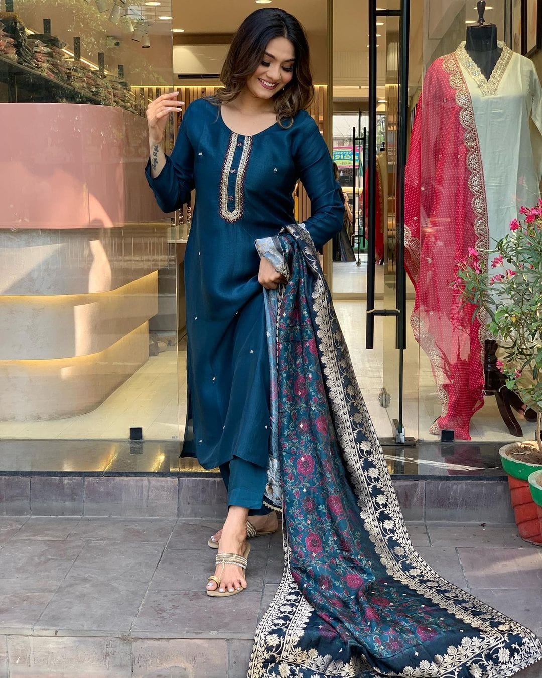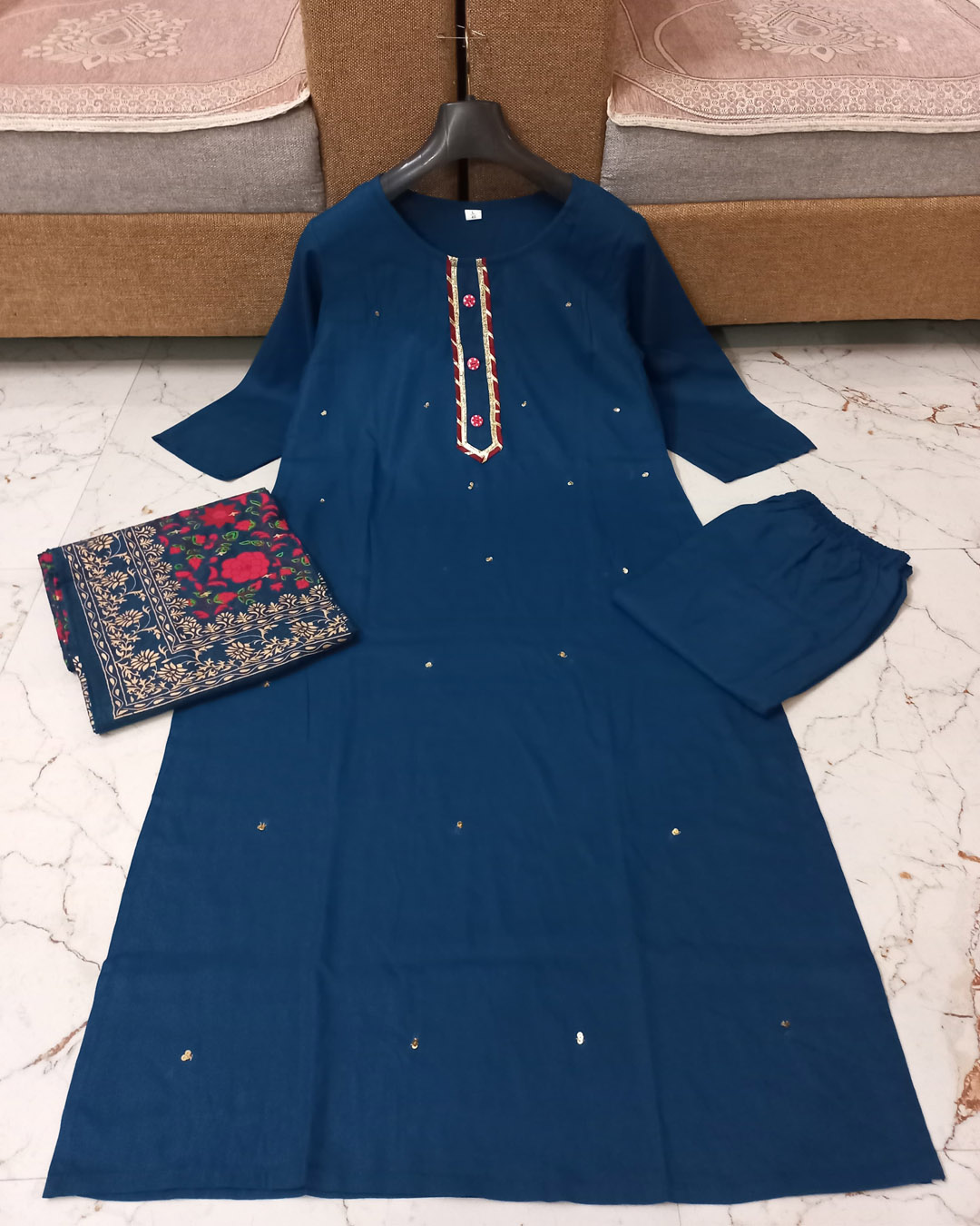 Introducing our stunning Blue Indian Rayon Straight Ethnic Salwar Kameez Kurti Pant Dupatta Set, a perfect blend of tradition and style. Crafted from soft, breathable rayon fabric, this elegant set features a straight-cut kurti paired with matching pants, offering both comfort and grace. The vibrant blue hue adds a touch of sophistication, making it perfect for festive occasions, casual outings, or cultural events. The set comes with a beautifully coordinated dupatta to complete the look. Elevate your ethnic wardrobe with this stylish, easy-to-wear ensemble that embodies timeless charm and modern flair. Ideal for women seeking comfort and elegance.