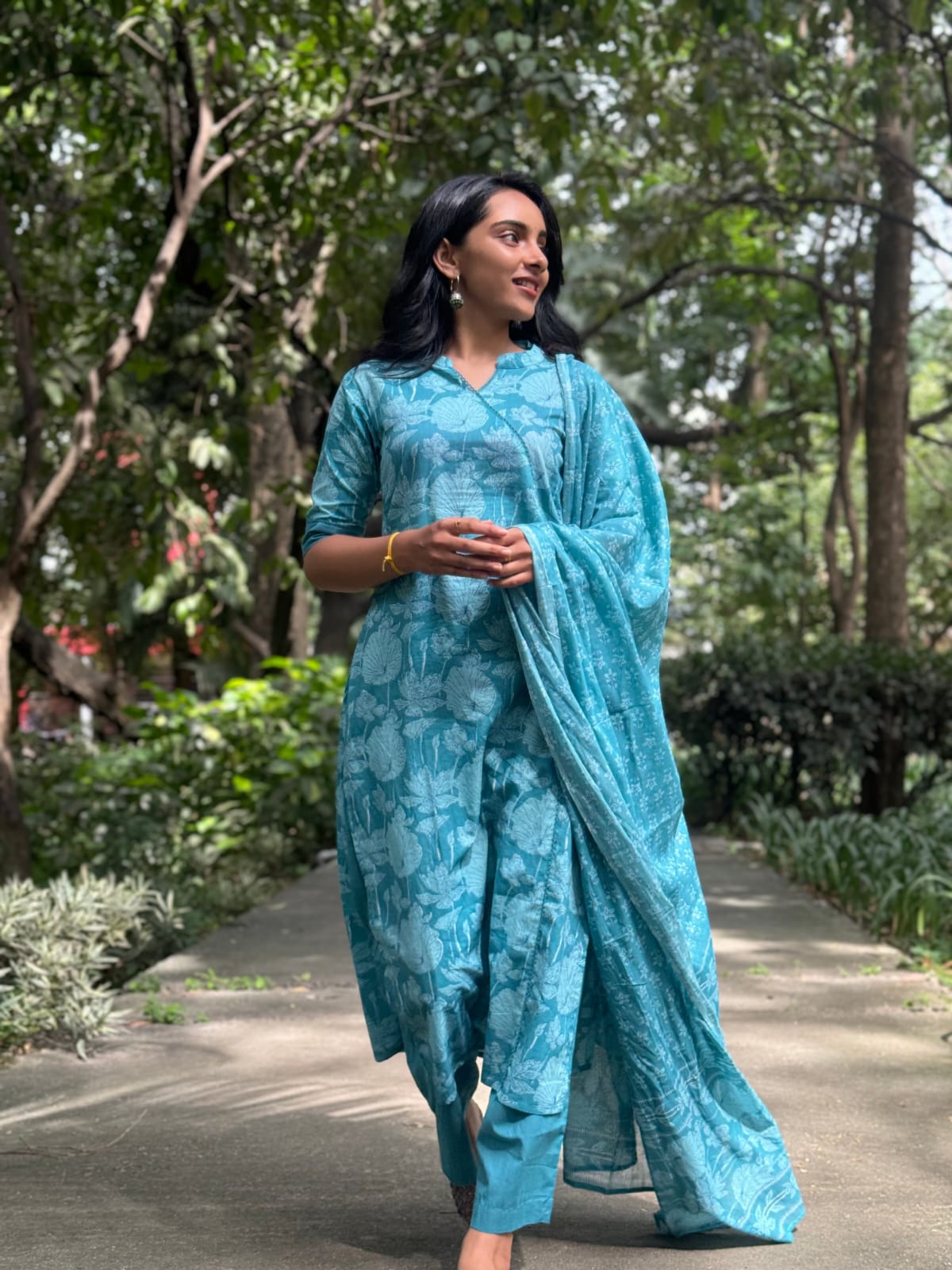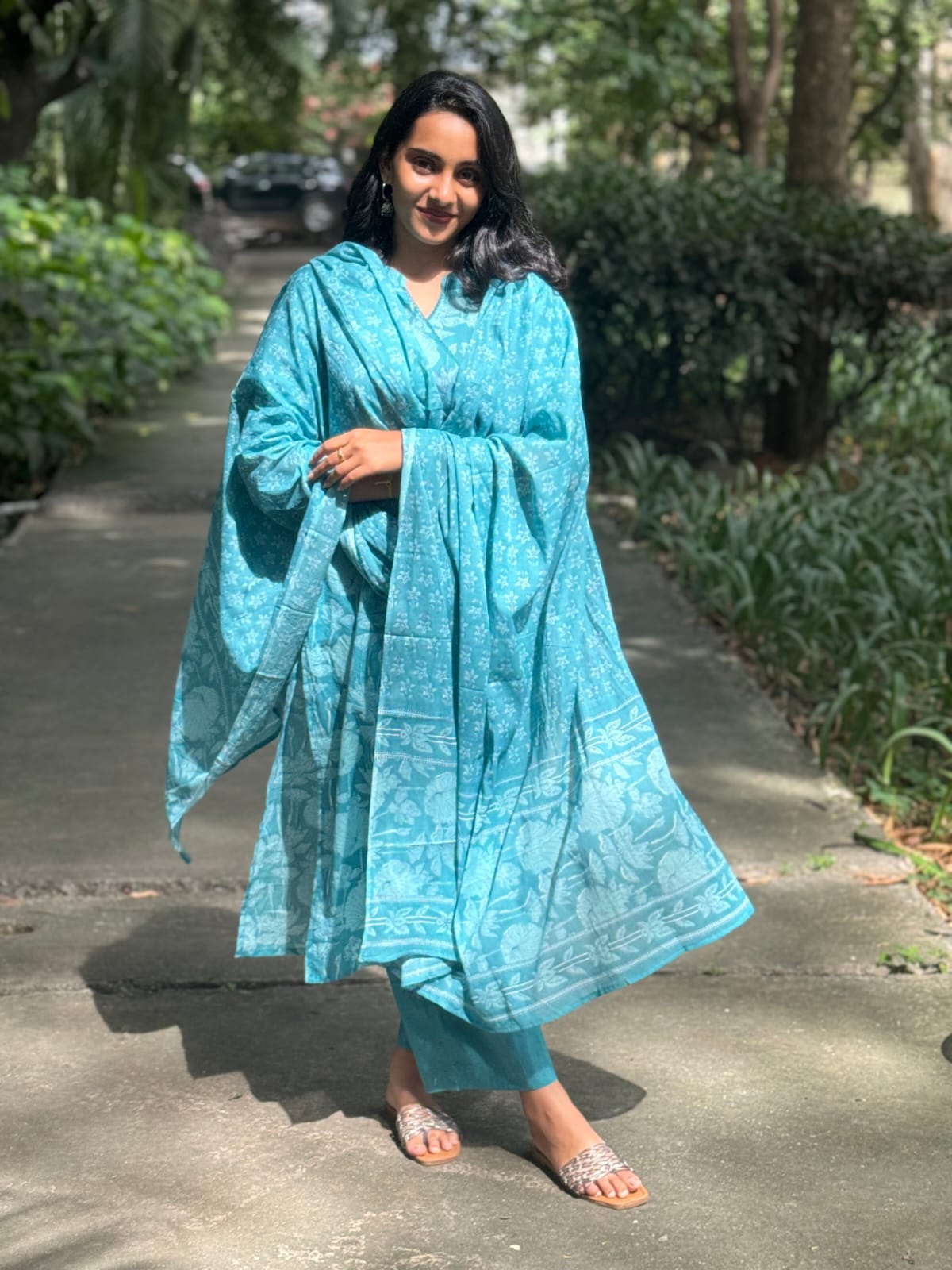 Turquoise Blue Floral Printed Cotton Straight Kurti Pant Dupatta Salwar Kameez Suit Set (Set of 3)