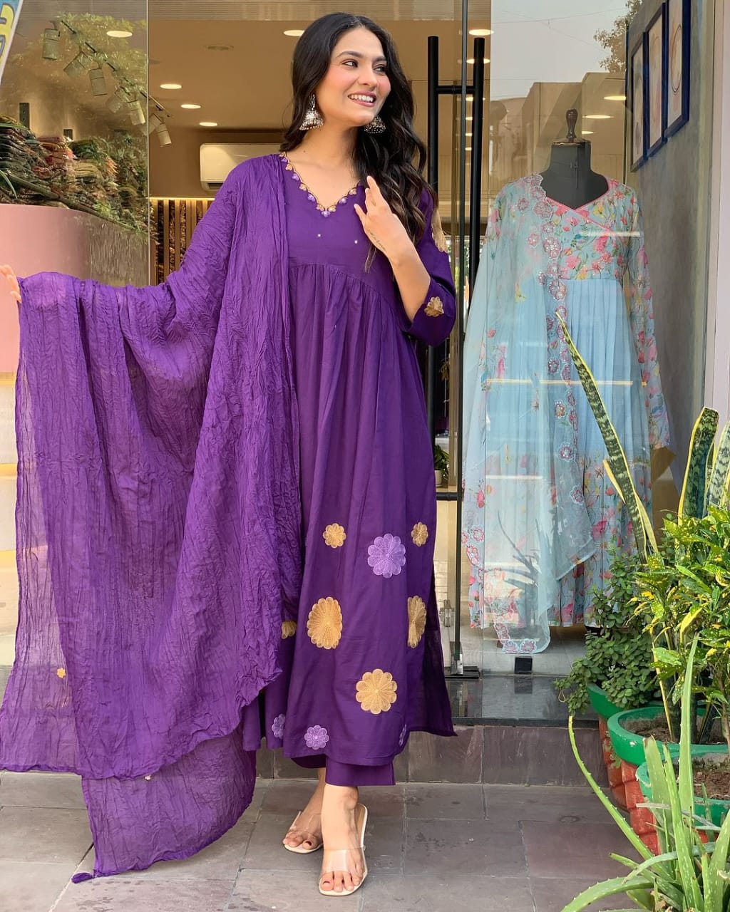 Experience elegance with our Purple Embroidered A-line Kurta Set. This sophisticated set includes a beautifully crafted Kurta with intricate embroidery, a matching pant, and a soft dupatta, creating a complete look perfect for any occasion. The A-line silhouette of the kurta flatters every body type, while the rich purple fabric adds a touch of timeless charm. The detailed embroidery enhances its luxurious appeal, making it ideal for festive gatherings or formal events. Made from high-quality cotton materials, this set offers both style and comfort, allowing you to look stunning without compromising on ease.