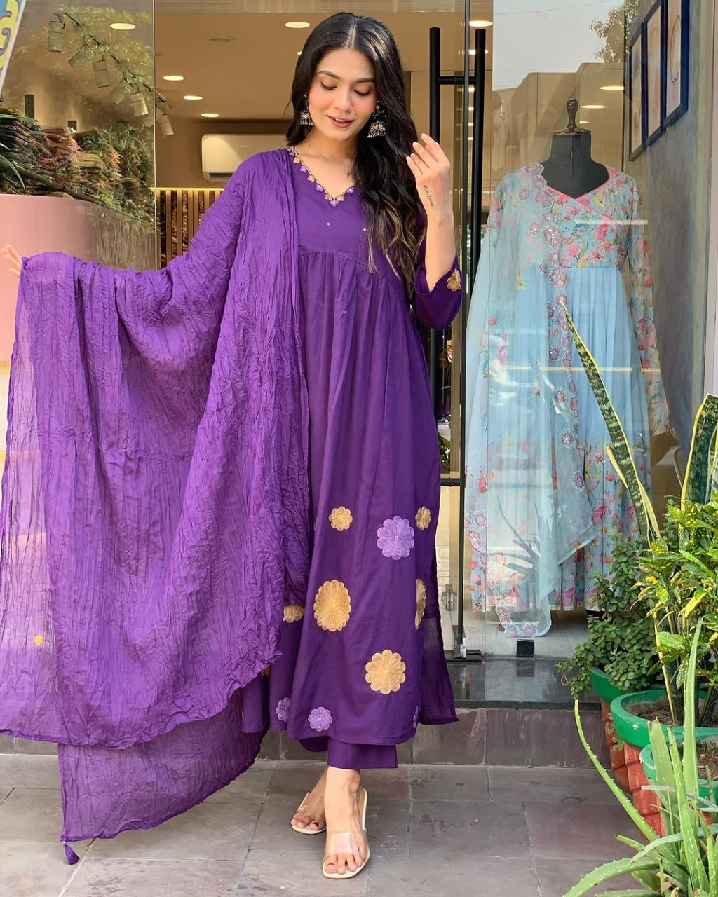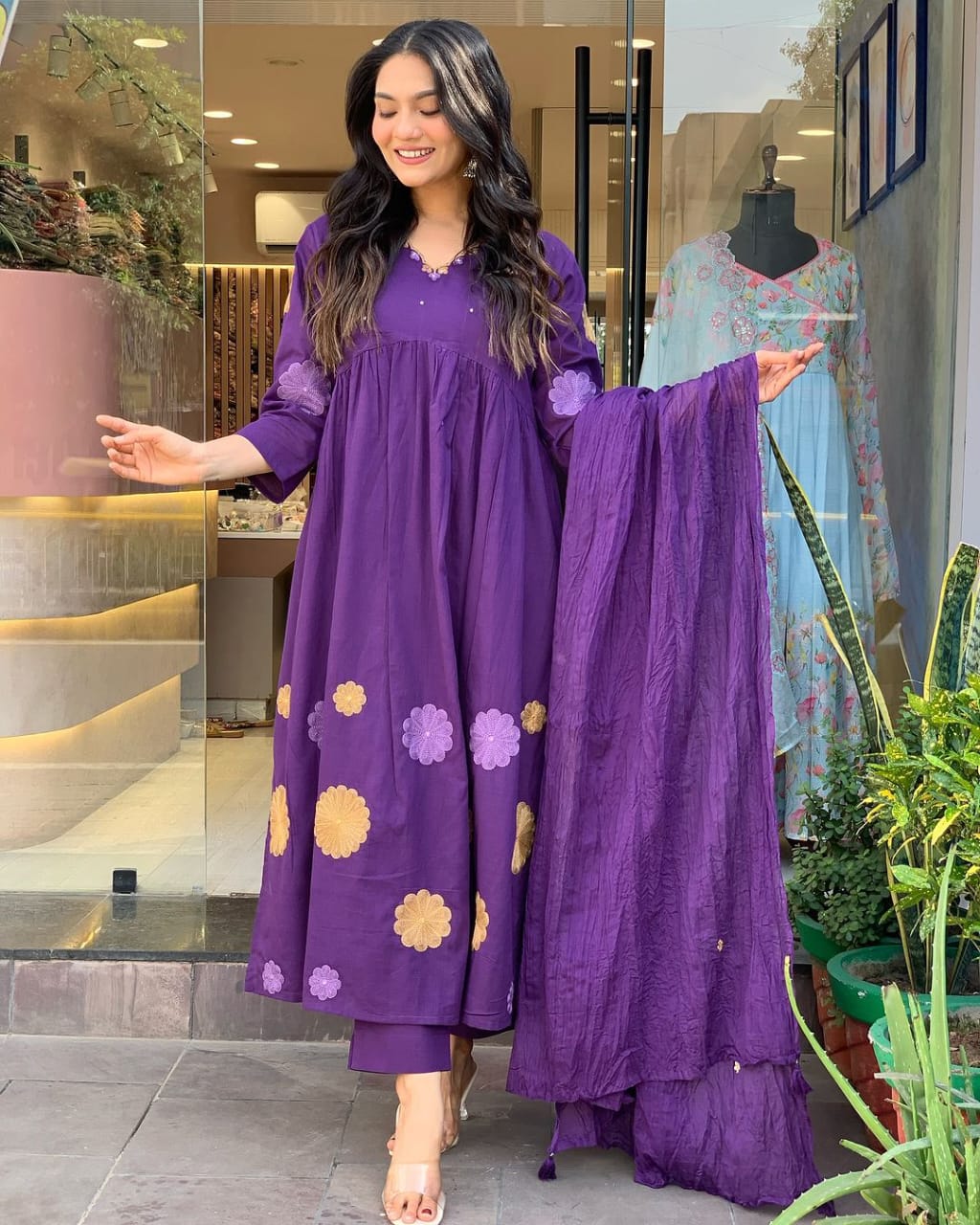 Zareen Purple Embroidered A-line Kurta Kurti Pant Dupatta Set Cotton Salwar Kameez Dress (Set of 3)