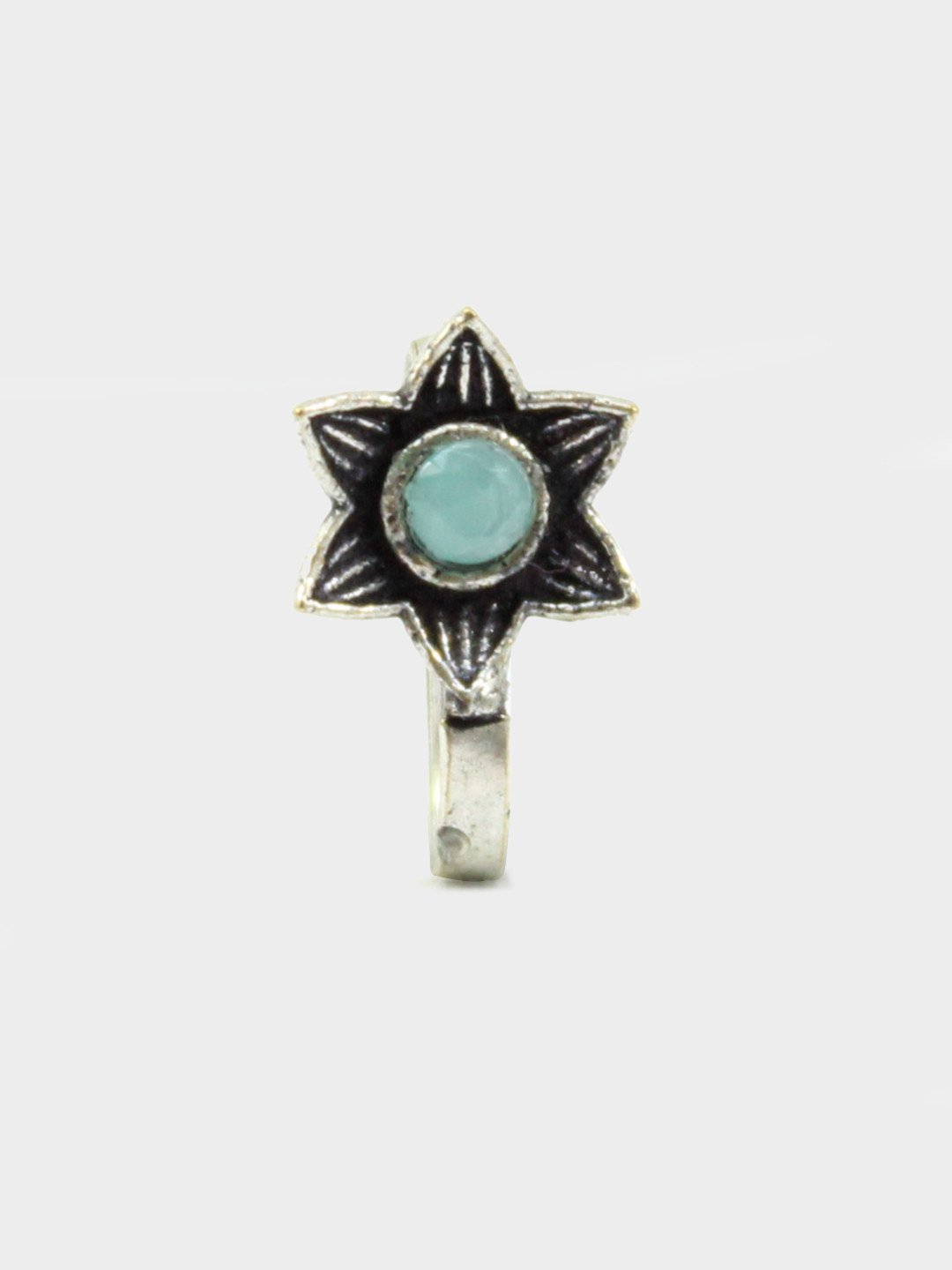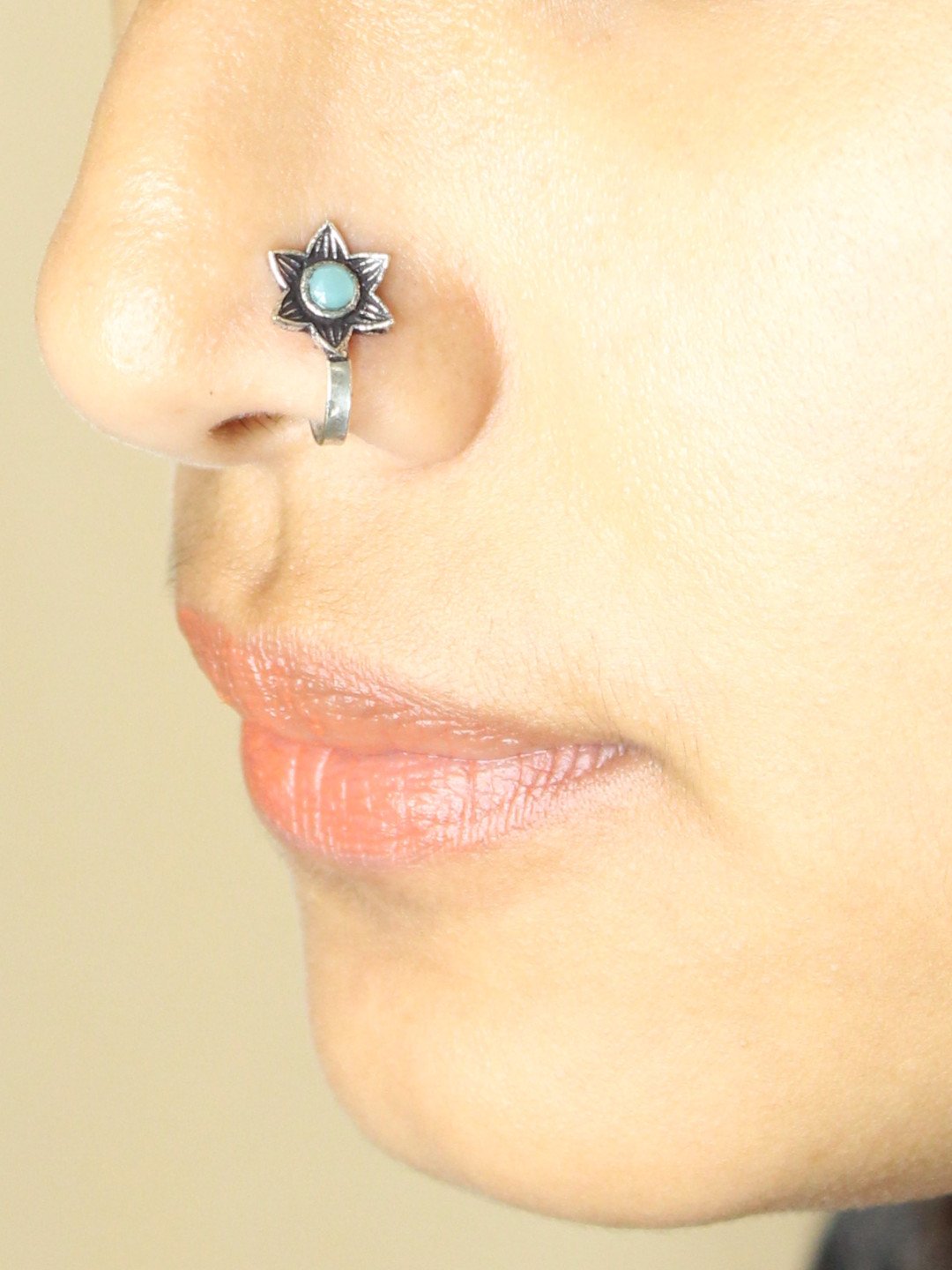 Non-Piercing Flower Nose Pin for Women Indian Oxidized Silver Plated Adjustable Free Size Brass Jewelry