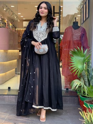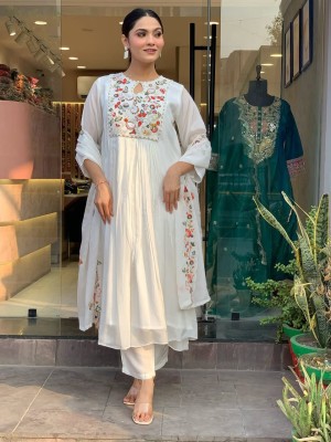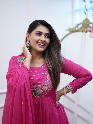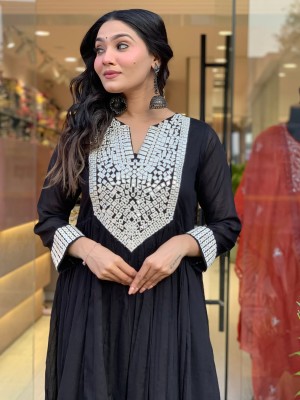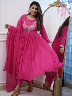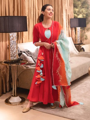 Women New Red Anarkali Salwar Kameez Kurti Pant Dupatta Set Flare Long Dress
