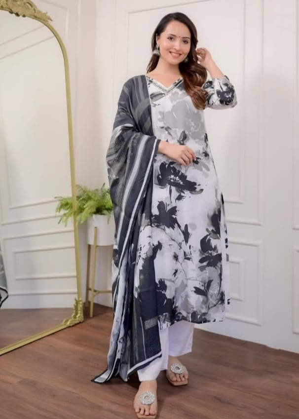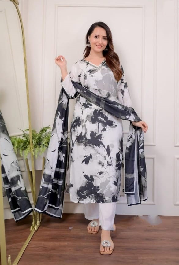 Aditi Black & White Printed Hand Work Straight Kurti Pant Dupatta Set Muslin Salwar Kameez Dress (Set of 3)
