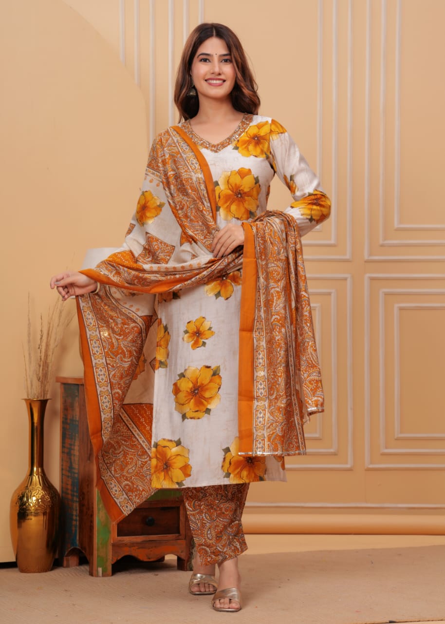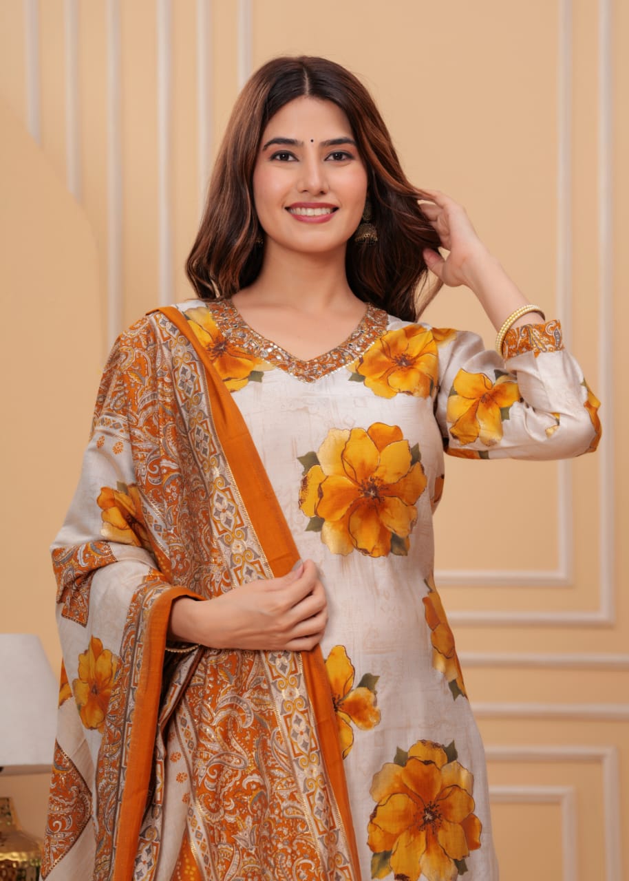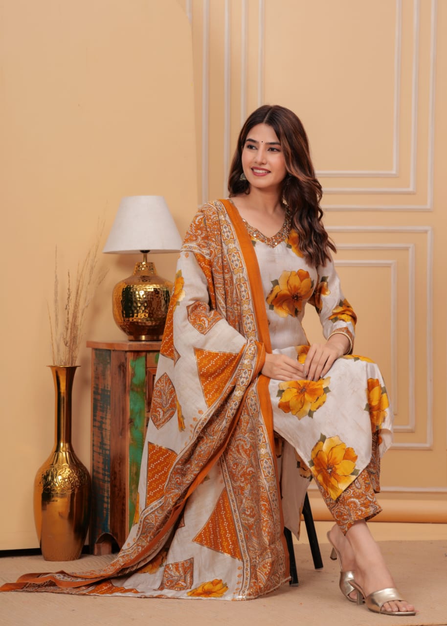 Orange Beige Floral Printed Straight Kurti Pant Dupatta Set Cotton Salwar Kameez Dress (Set of 3)