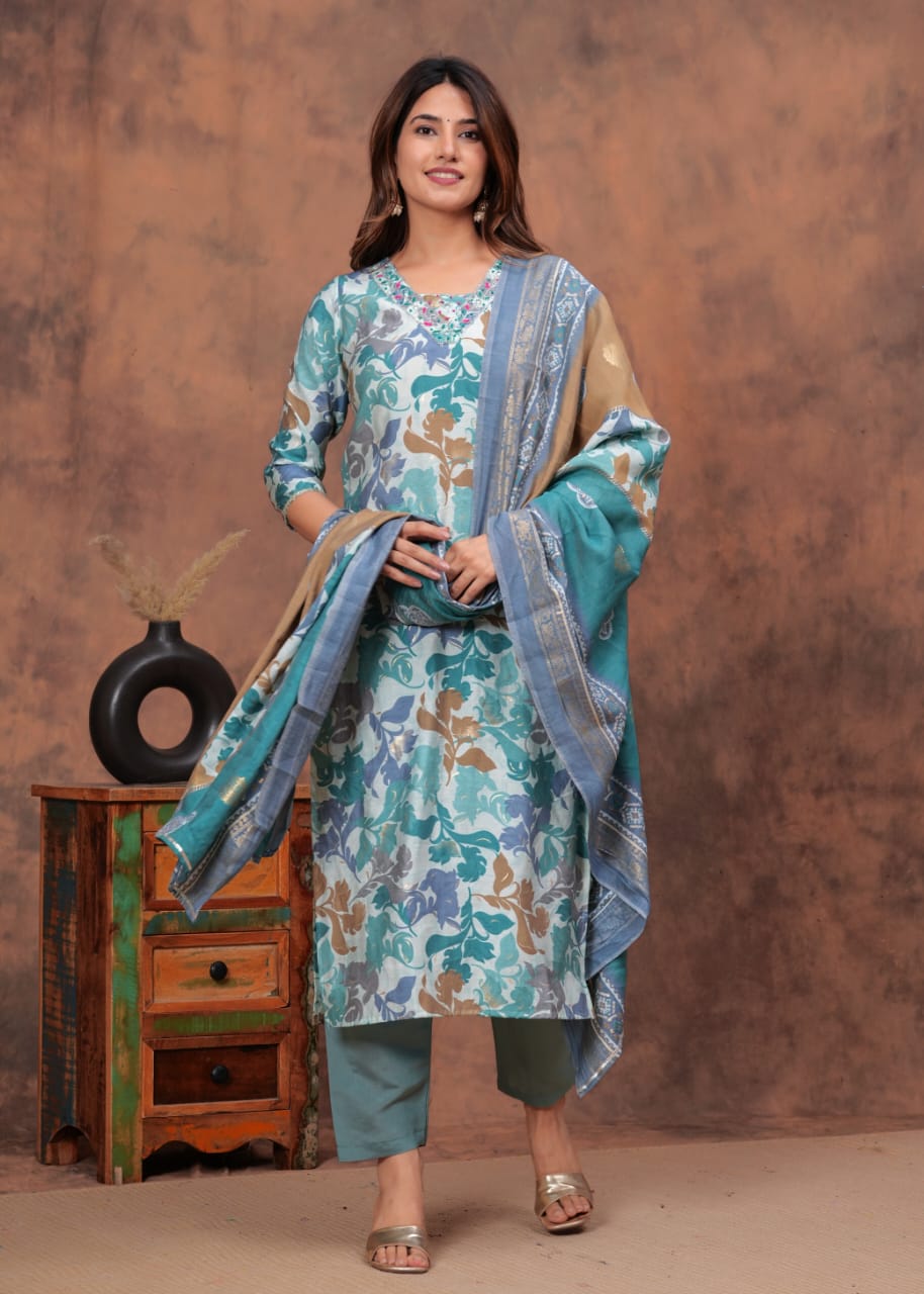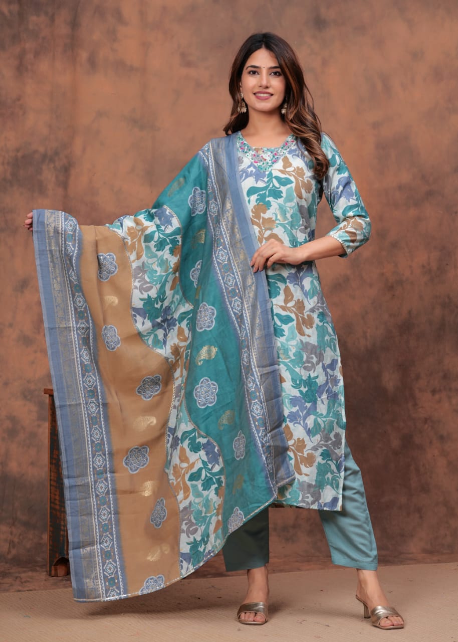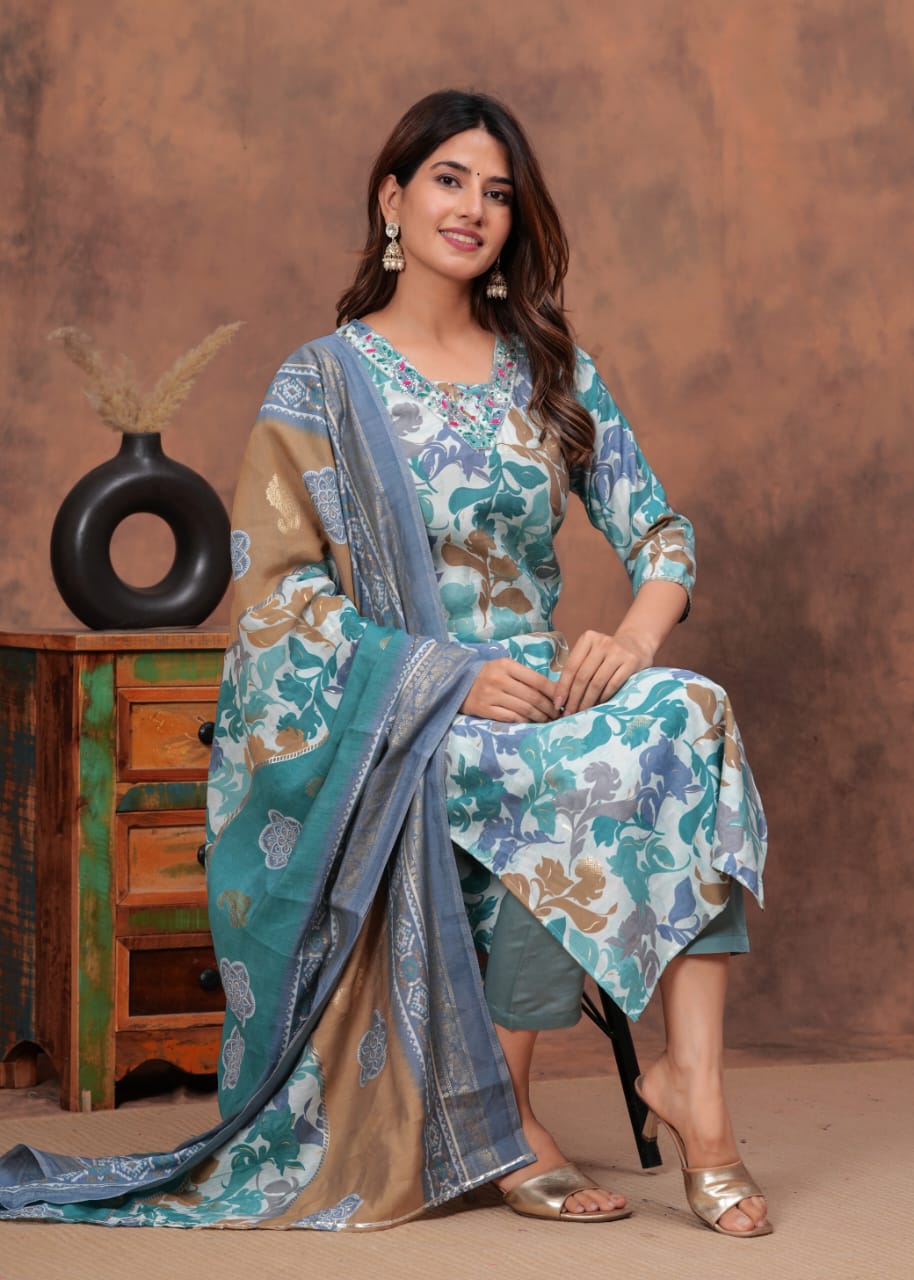 This Blue Casual Floral Printed Kurti Pant Dupatta Set offers a perfect blend of comfort and style. Crafted from soft muslin fabric, the straight-cut kurti features a vibrant floral print that exudes elegance and charm. The set includes matching pants for a coordinated look, while the accompanying dupatta adds a graceful touch. Ideal for casual outings or festive occasions, this 3-piece ensemble ensures a relaxed yet chic appearance. With its breathable fabric and modern design, this Salwar Kameez Dress promises both style and comfort, making it a versatile addition to any wardrobe. Perfect for everyday wear or special events.